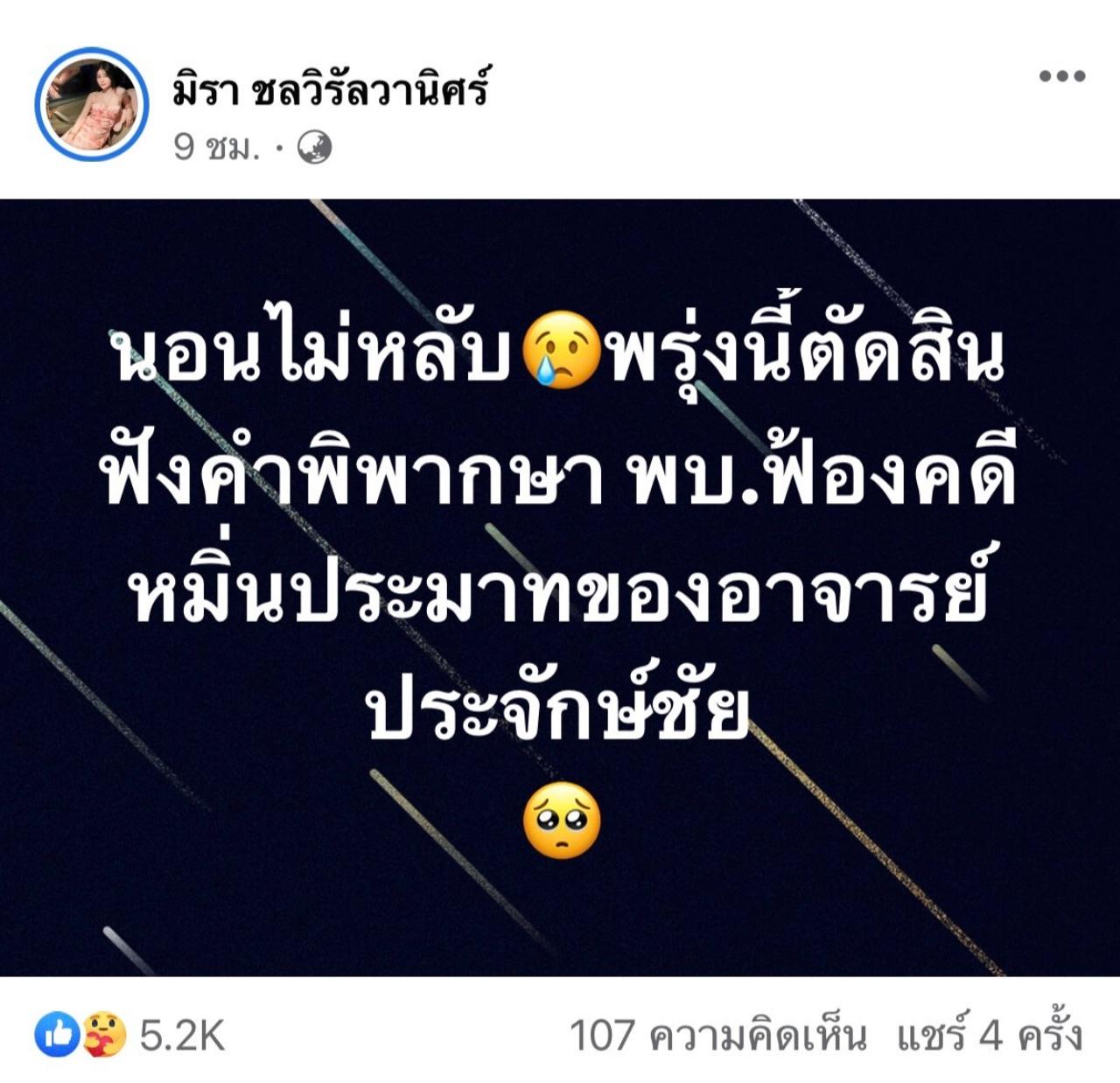 ทำเอา เอ๋ มิรา ชลวิรัลวานิศร์ ถึงกับนอนไม่หลับ ต้องโพสต์ข้อความระบายความรู้สึกที่เป็นห่วง นายห้างประจักษ์ชัย ไหทองคำ ผู้มีพระคุณที่ยื่นมือเข้ามาช่วยในวันที่ตัวเองนั้นลำบาก ผ่านทางเฟซบุ๊กส่วนตัวของตัวเอง โดยเจ้าตัวได้โพสต์ข้อความที่ระบุว่า “นอนไม่หลับ พรุ่งนี้ตัดสินฟังคำพิพากษา พบ.ฟ้องคดีหมิ่นประมาทของอาจารย์ประจักษ์ชัย” พร้อมแปะอีโมจิหน้าเศร้า