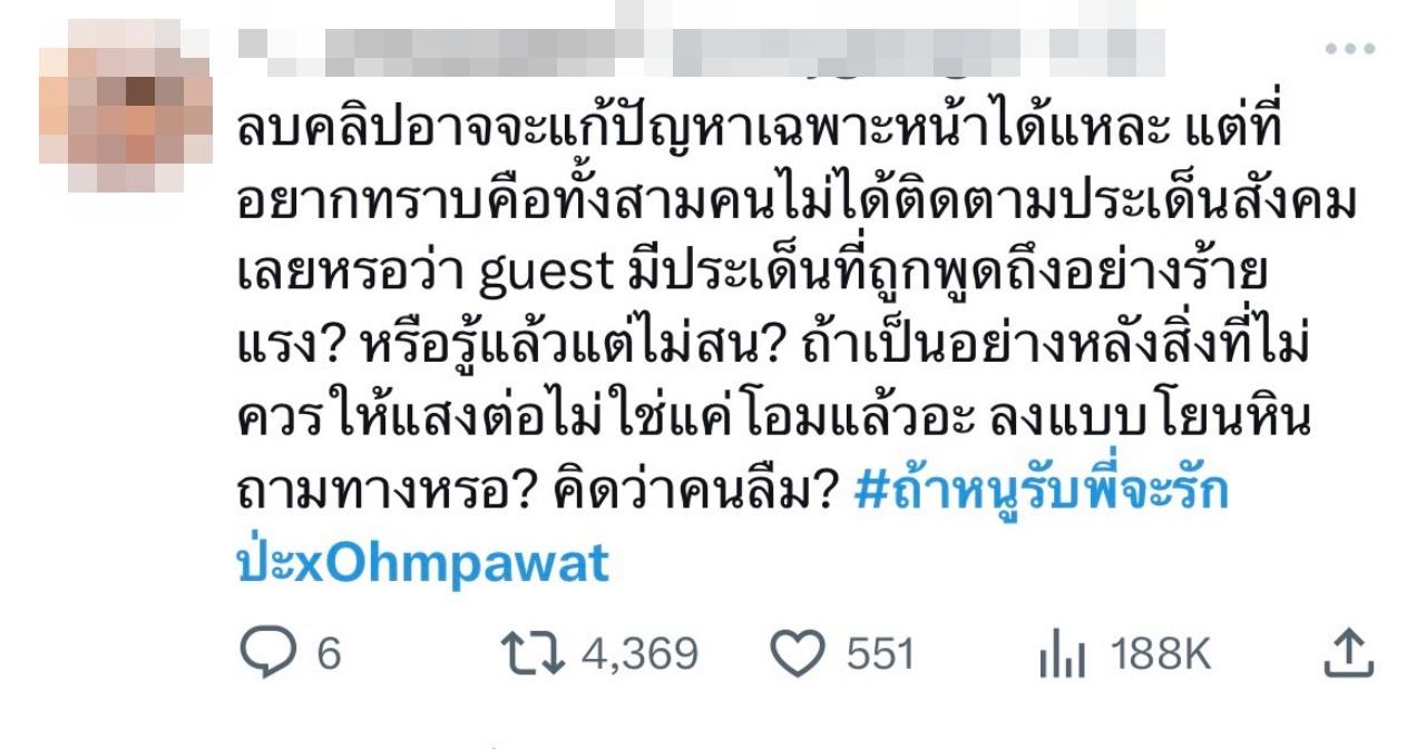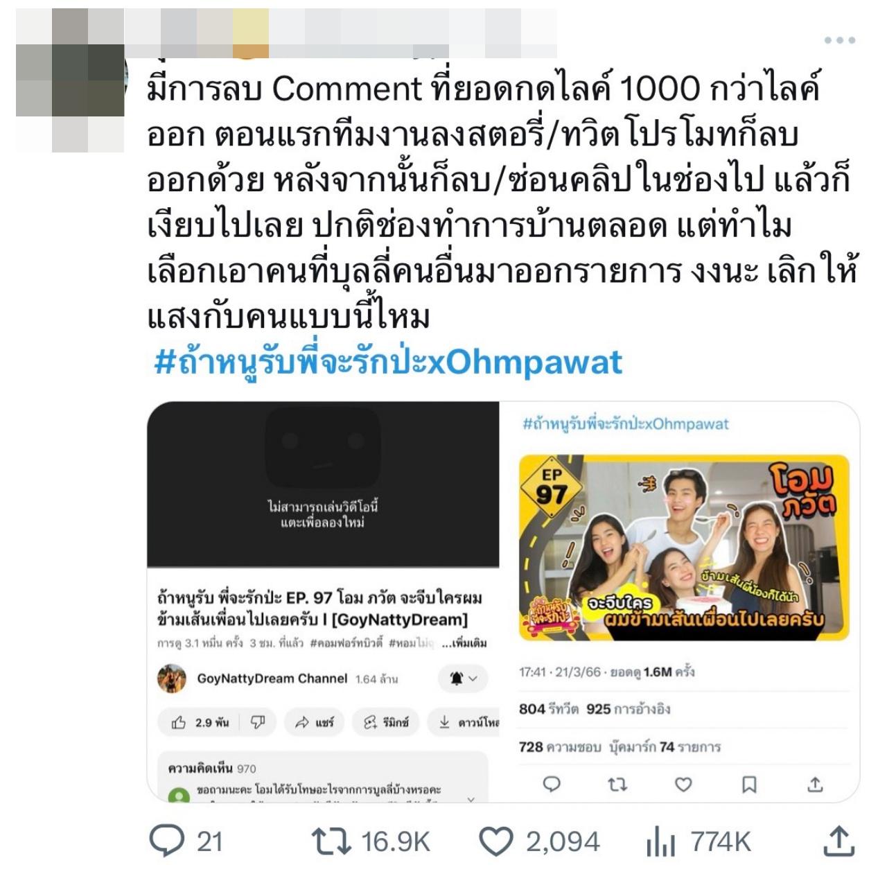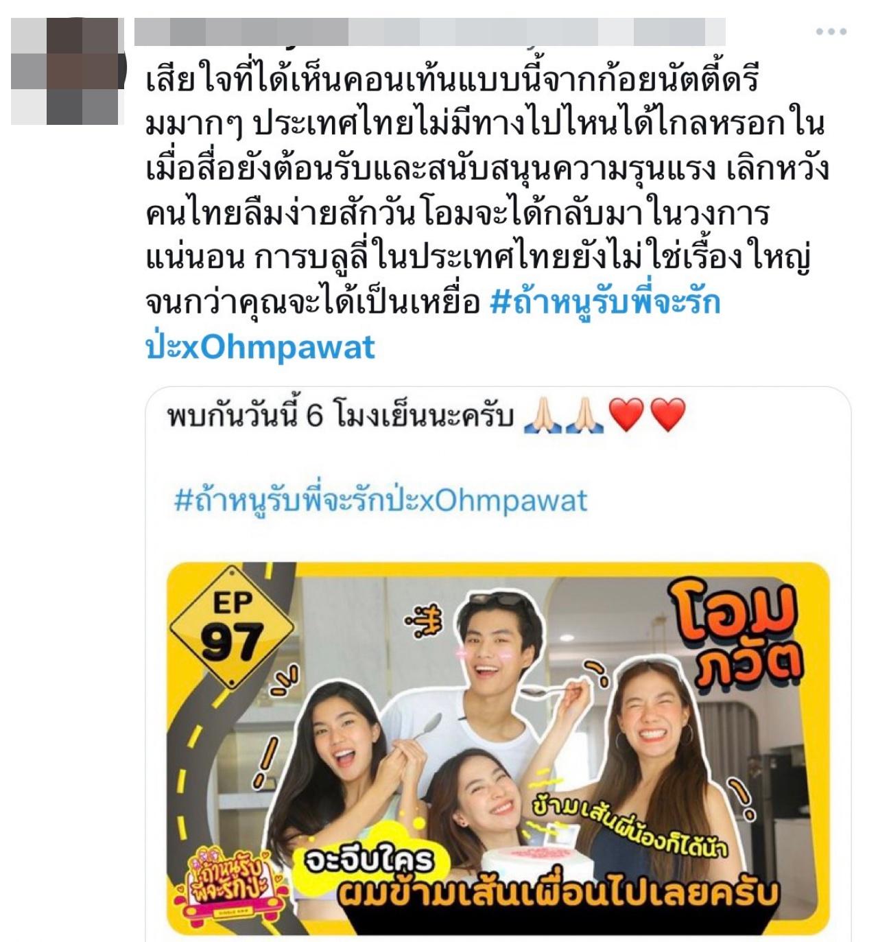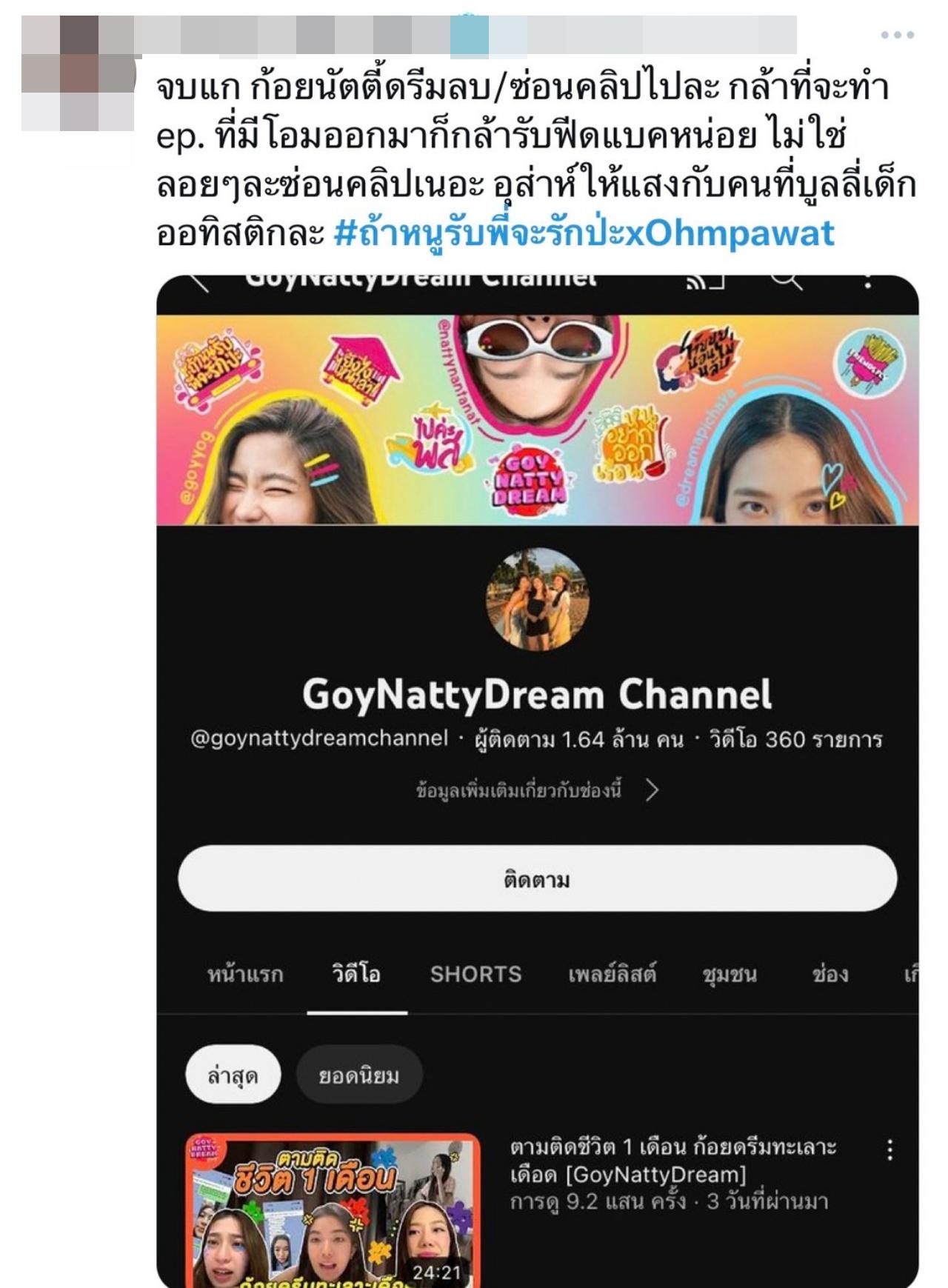 เพราะทัวร์ลงหนักแบบนี้เลยทำให้ #ถ้าหนูรับพี่จะรักป่ะxOhmpawat พุ่งติดเทรนด์ทวิตเตอร์ โดยชาวทวิตฯ ได้แสดงความคิดเห็นถึงเรื่องนี้เอาไว้ว่า "จบแก ก้อยนัตตี้ดรีมลบ/ซ่อนคลิปไปละ กล้าที่จะทำ ep. ที่มีโอมออกมาก็กล้ารับฟีดแบ็กหน่อย ไม่ใช่ลอยๆ ละซ่อนคลิปเนอะ อุตส่าห์ให้แสงกับคนที่บูลลี่เด็กออทิสติกละ #ถ้าหนูรับพี่จะรักป่ะxOhmpawat, เสียใจที่ได้เห็นคอนเทนต์แบบนี้จากก้อยนัตตี้ดรีมมากๆ ประเทศไทยไม่มีทางไปไหนได้ไกลหรอก ในเมื่อสื่อยังต้อนรับและสนับสนุนความรุนแรง เลิกหวังคนไทยลืมง่ายสักวันโอมจะได้กลับมาในวงการแน่นอน การบูลลี่ในประเทศไทยยังไม่ใช่เรื่องใหญ่จนกว่าคุณจะได้เป็นเหยื่อ #ถ้าหนูรับพี่จะรักป่ะxOhmpawat".