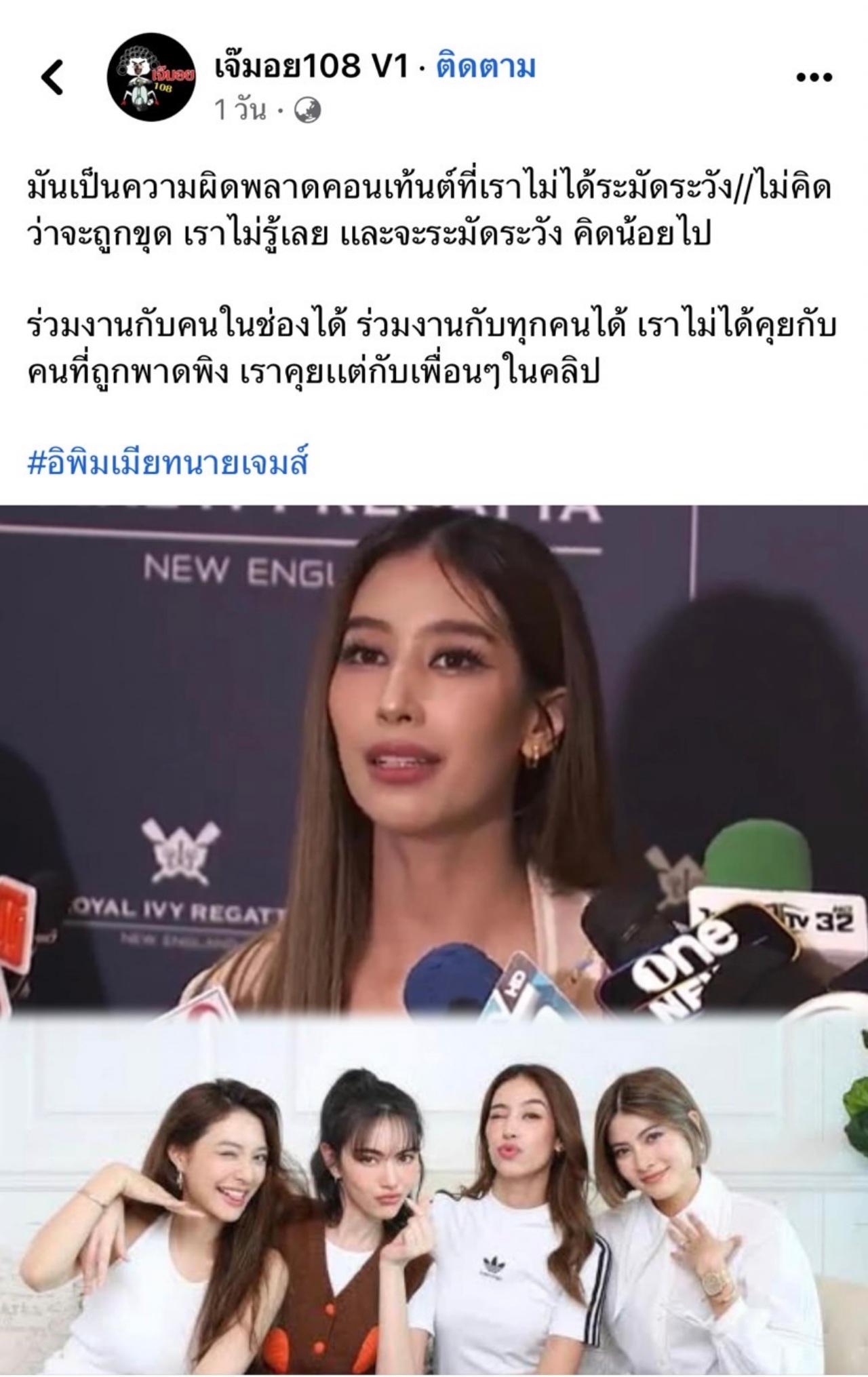 ซึ่งในเพจดังอย่าง เจ๊มอย 108 ก็ได้สรุปประเด็นที่ มิ้นต์ ชาลิดา ให้สัมภาษณ์กับสื่อมวลชน โดยบอกว่า "มันเป็นความผิดพลาดคอนเทนต์ที่เราไม่ได้ระมัดระวัง//ไม่คิดว่าจะถูกขุด เราไม่รู้เลย และจะระมัดระวัง คิดน้อยไป ร่วมงานกับคนในช่องได้ ร่วมงานกับทุกคนได้ เราไม่ได้คุยกับคนที่ถูกพาดพิง เราคุยเเต่กับเพื่อนๆในคลิป #อิพิมเมียทนายเจมส์"