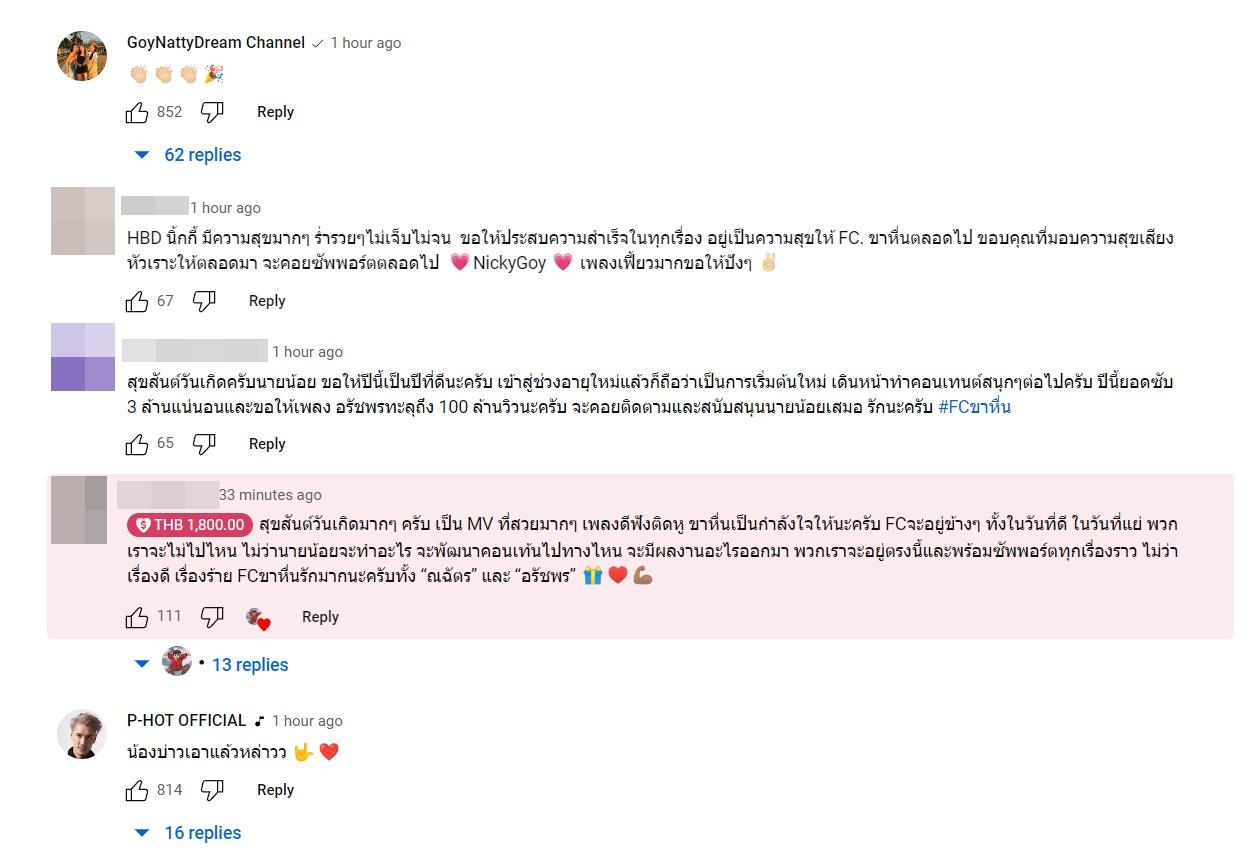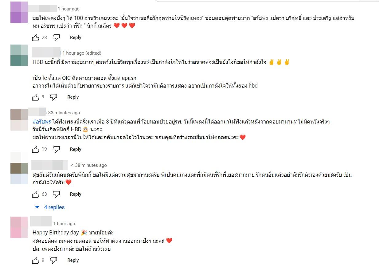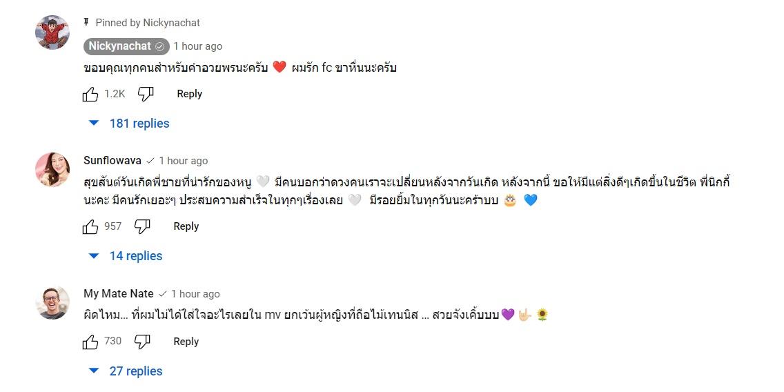ท่ามกลางคอมเมนต์จากแฟนๆ ที่มาร่วมอวยพรวันเกิด พร้อมทั้งชื่นชมเพลงของนิกกี้และ P-HOT เป็นจำนวนมาก นอกจากนี้แอกเคานต์ยูทูบ GoyNattyDream Channel ก็ได้เข้ามาคอมเมนต์เป็นอีโมจิปรบมือและเปเปอร์ชู้ตด้วย.