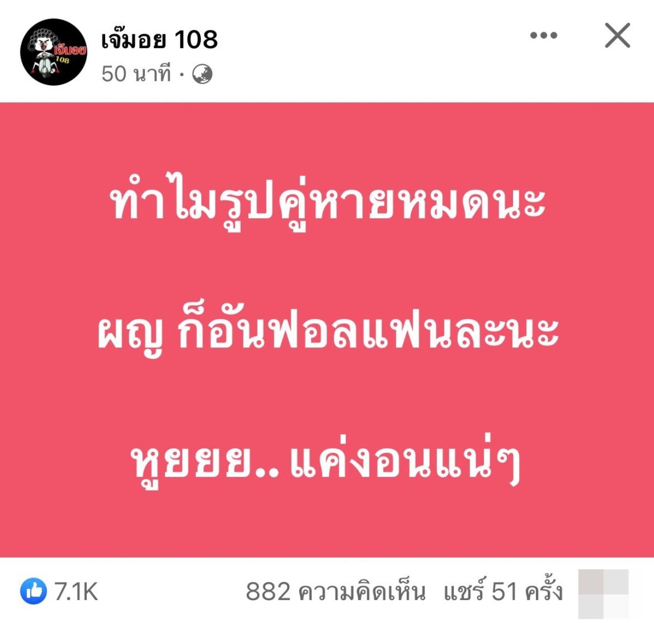 วันหยุดยาวๆ ก็มีเรื่องให้แฟนๆ ต้องช็อกไม่น้อย เพราะจู่ๆ เพจดังอย่าง เจ๊มอย 108 ก็ได้โพสต์ข้อความถึงคู่รักดาราคู่หนึ่ง เอาไว้ว่า "ทำไมรูปคู่หายหมดนะ ผญ ก็อันฟอลแฟนละนะ หูยยย.. แค่งอนแน่ๆ"