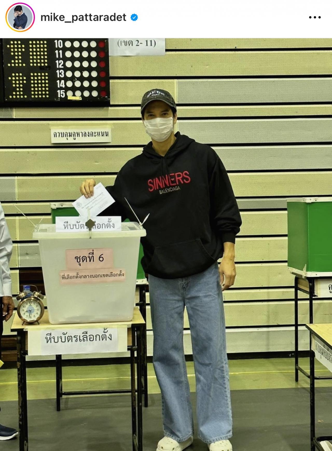 ส่วนพระเอกหนุ่ม ไมค์ ภัทรเดช ได้โพสต์รูปตนเองขณะหย่อนบัตรเลือกตั้งใส่หีบในคูหา พร้อมเขียนแคปชั่นด้วยว่า “วันนี้ไมค์ออกมาใช้สิทธิเลือกตั้งล่วงหน้าเรียบร้อยครับ เชื่อว่าตอนนี้คนไทยให้ความสำคัญเกี่ยวกับการเมืองมากขึ้น มีหลายช่องทางที่เราสามารถศึกษานโยบาย วิสัยทัศน์ เพื่อใช้ประกอบการตัดสินใจ