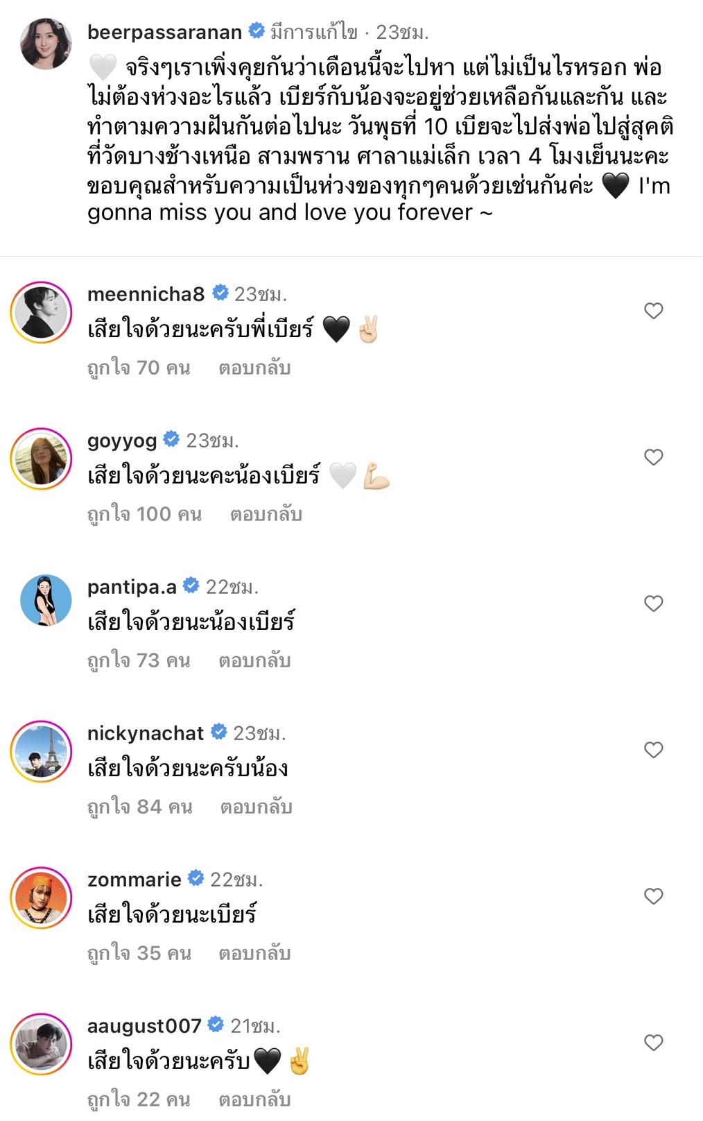 ล่าสุดสาว เบียร์ เดอะวอยซ์ ได้โพสต์ภาพในอินสตาแกรมส่วนตัว เป็นภาพสีขาวดำเมื่อครั้งนั่งทานข้าวพร้อมหน้าคุณพ่อและน้องชาย พร้อมเขียนแคปชั่นสุดเศร้าว่า “จริงๆเราเพิ่งคุยกันว่าเดือนนี้จะไปหา แต่ไม่เป็นไรหรอก พ่อไม่ต้องห่วงอะไรแล้ว เบียร์กับน้องจะอยู่ช่วยเหลือกันและกัน และทำตามความฝันกันต่อไปนะ
