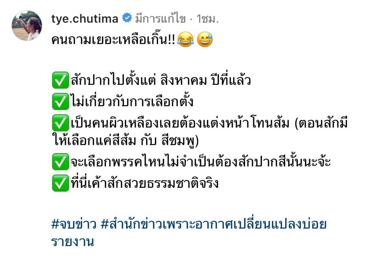 โดย ต่าย ชุติมา ได้โพสต์รูปข่าวและเขียนไขข้อข้องใจเกี่ยวกับสีปากของเธอให้ทุกคนได้หายสงสัยว่า "คนถามเยอะเหลือเกิ๊น!! สักปากไปตั้งแต่ สิงหาคม ปีที่แล้ว ไม่เกี่ยวกับการเลือกตั้ง เป็นคนผิวเหลืองเลยต้องแต่งหน้าโทนส้ม (ตอนสักมีให้เลือกแค่สีส้ม กับสีชมพู)
