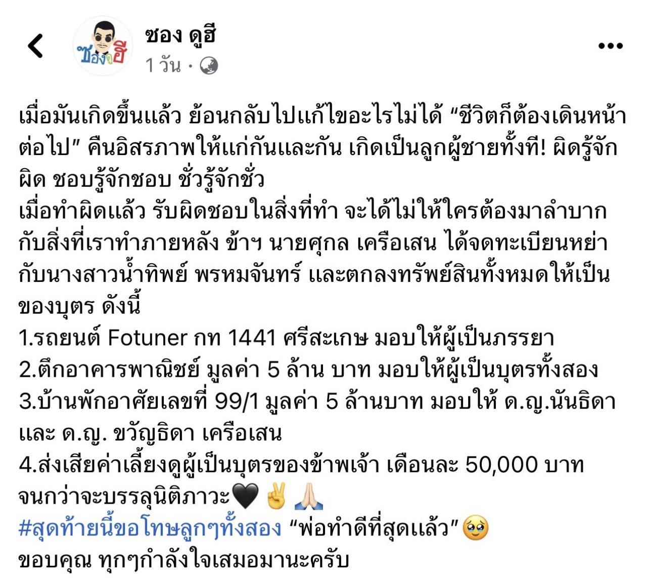 เกิดเป็นลูกผู้ชายทั้งที! ผิดรู้จักผิด ชอบรู้จักชอบ ชั่วรู้จักชั่ว เมื่อทำผิดแล้ว รับผิดชอบในสิ่งที่ทำ จะได้ไม่ให้ใครต้องมาลำบากกับสิ่งที่เราทำภายหลัง ข้าฯ นายศุกล เครือเสน ได้จดทะเบียนหย่ากับ นางสาวน้ำทิพย์ และตกลงทรัพย์สินทั้งหมดให้เป็นของบุตร ดังนี้