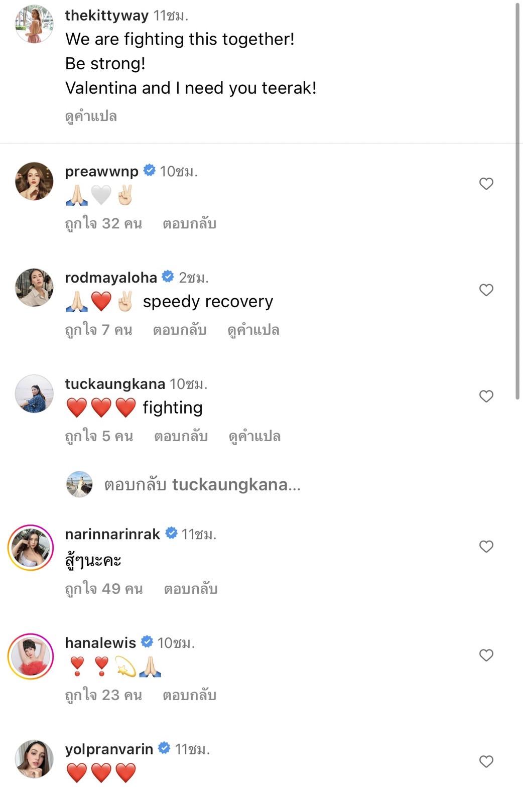 ล่าสุดอินสตาแกรมภรรยาพระเอกชื่อดัง อย่าง คิตตี้ คริสติน่า วิงเคลอร์ ได้เคลื่อนไหวโพสต์อินสตาแกรมส่วนตัว เผยเป็นภาพกุมมือหนุ่มเอส พร้อมแคปชั่นบอกว่า "We are fighting this together! Be strong! Valentina and I need you teerak!" ซึ่งแปลได้ว่า "เรากำลังต่อสู้ไปพร้อมกัน เข้มแข็งนะ วาเลนติน่าและฉันต้องการคุณ ที่รัก"