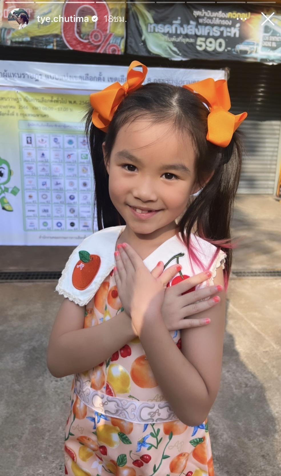 ทั้งนี้ แม่ต่าย ยังได้อวดคลิปความน่ารักของน้องพิพิมที่แต่งตัวจัดเต็มสีส้มทั้งตัว ลงบนอินสตาแกรมส่วนตัว พร้อมกับระบุข้อความว่า "ลูกสาวจัดเต็มมาก" ทำเอาคนแห่คอมเมนต์กันเป็นจำนวนมาก.