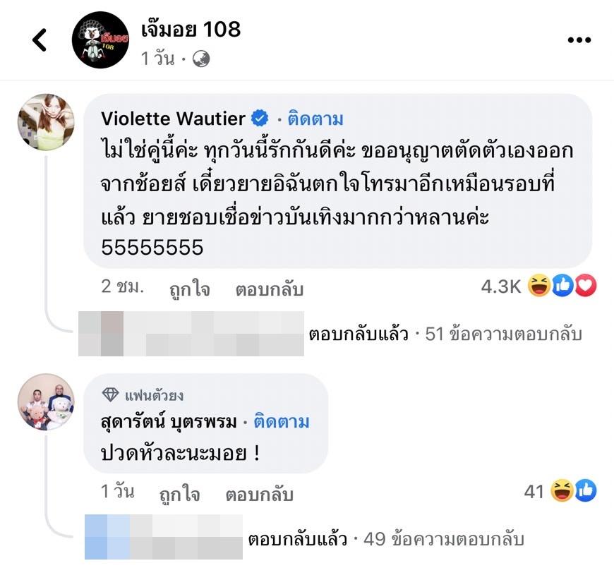 และหนึ่งในคู่รักดังอย่างนักร้องสาว วี วิโอเลต วอเทียร์ กับพระเอก-นักดนตรีหนุ่มหน้าใส เก้า จิรายุ ละอองมณี ก็ไม่พ้นถูกโยงเช่นกัน งานนี้วีก็ไม่รอช้า รีบออกมาเคลียร์ชัดด้วยการคอมเมนต์ใต้เพจดังกล่าวแบบชัดเจนว่า “ไม่ใช่คู่นี้ค่ะ ทุกวันนี้รักกันดีค่ะ ขออนุญาตตัดตัวเองออกจากช้อยส์ เดี๋ยวยายอิฉันตกใจโทรมาอีกเหมือนรอบที่แล้ว ยายชอบเชื่อข่าวบันเทิงมากกว่าหลานค่ะ 55555555”