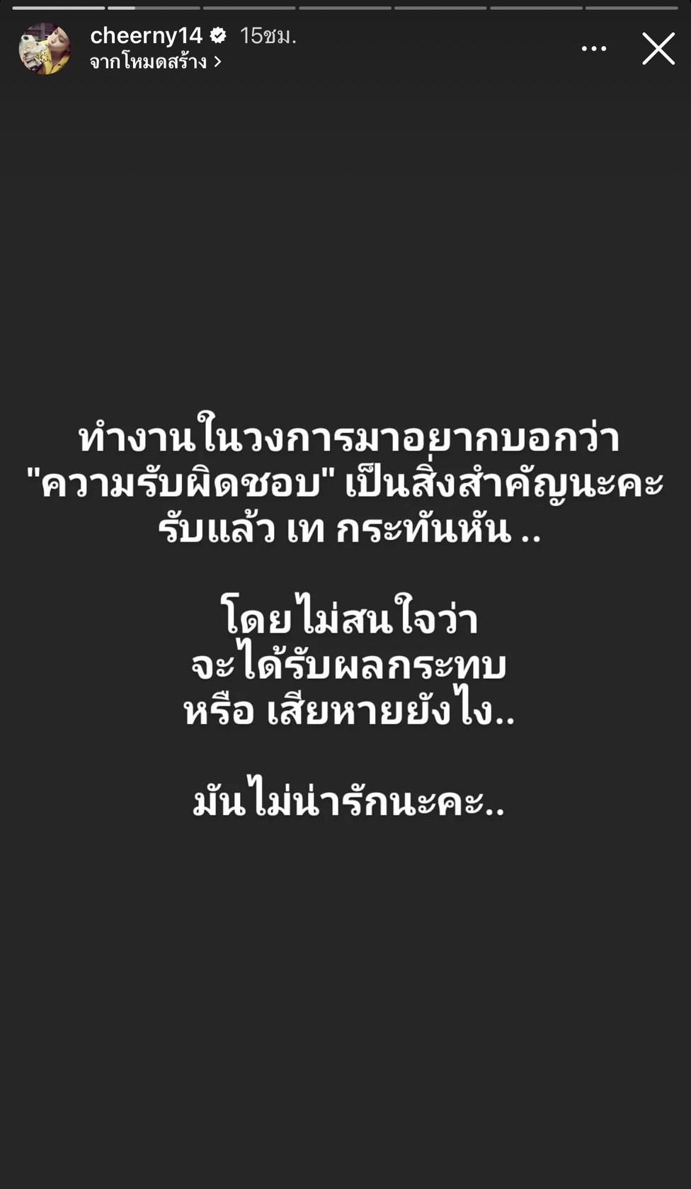 ซึ่งข้อความดังกล่าว สาวเชียร์ ได้โพสต์ผ่านผ่านอินสตาแกรมสตอรี่ว่า "ทำงานในวงการมาอยากบอกว่า "ความรับผิดชอบ" เป็นสิ่งสำคัญนะคะ รับแล้ว เท กะทันหัน..โดยไม่สนใจว่าจะได้รับผลกระทบ หรือเสียหายยังไง..มันไม่น่ารักนะคะ.."