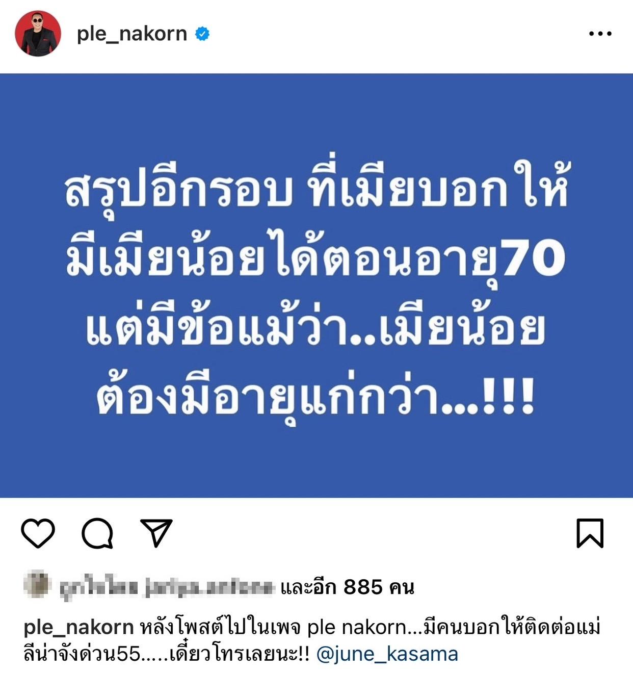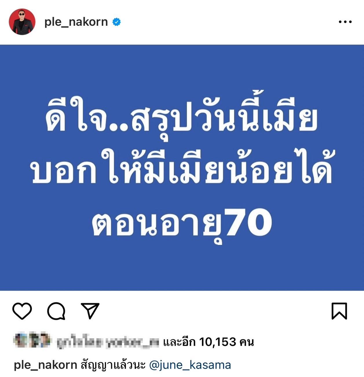 โดยเนื้อหาใจความมีอยู่ว่า "ดีใจ...สรุปวันนี้เมียบอกให้มีเมียน้อยได้ ตอนอายุ 70" พร้อมเขียนแคปชั่นกำกับย้ำไว้ "สัญญาแล้วนะ @june_kasama"