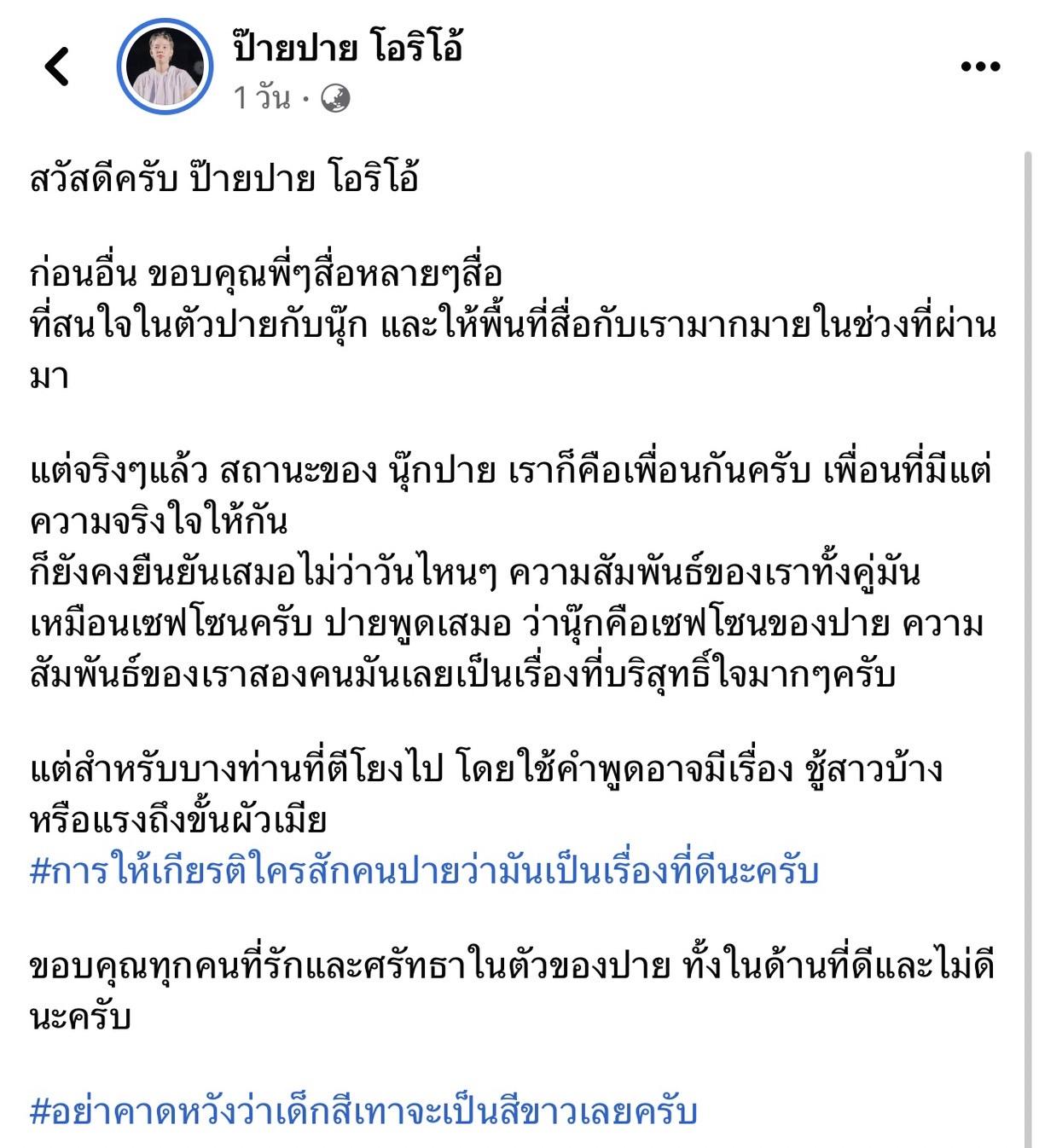 ส่วนทางด้านของ ป๊ายปาย โอริโอ้ ออกมาเปิดใจผ่านเฟซบุ๊กส่วนตัวว่า "สวัสดีครับ ป๊ายปาย โอริโอ้ ก่อนอื่น ขอบคุณพี่ๆ สื่อหลายๆ สื่อที่สนใจในตัวปายกับนุ๊ก และให้พื้นที่สื่อกับเรามากมายในช่วงที่ผ่านมา