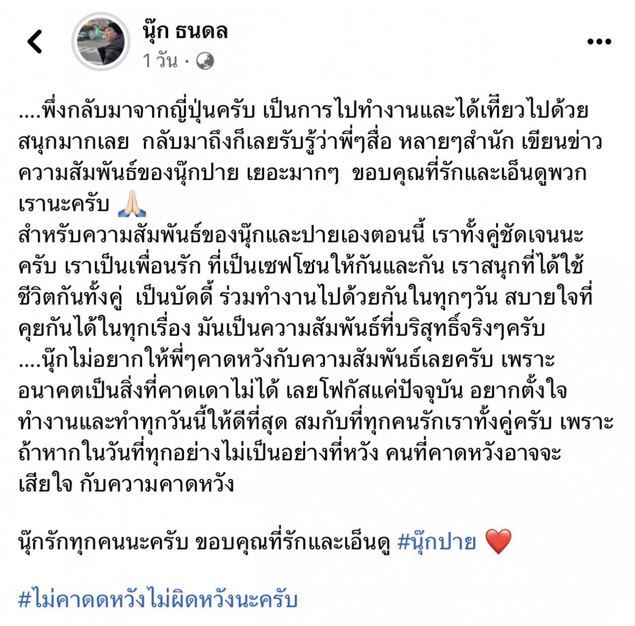 แต่งานนี้ก็ยังมีคนเชียร์ให้ทั้งคู่เป็นแฟนกันจริงๆ จนกระทั่งล่าสุด นุ๊ก ธนดล ได้ออกมาเผยความรู้สึกผ่านเฟซบุ๊กส่วนตัว โดยบอกว่า "….เพิ่งกลับมาจากญี่ปุ่นครับ เป็นการไปทำงานและได้เที่ยวไปด้วย สนุกมากเลย กลับมาถึงก็เลยรับรู้ว่าพี่ๆ สื่อ หลายๆ สำนัก เขียนข่าวความสัมพันธ์ของนุ๊กปาย เยอะมากๆ ขอบคุณที่รักและเอ็นดูพวกเรานะครับ
