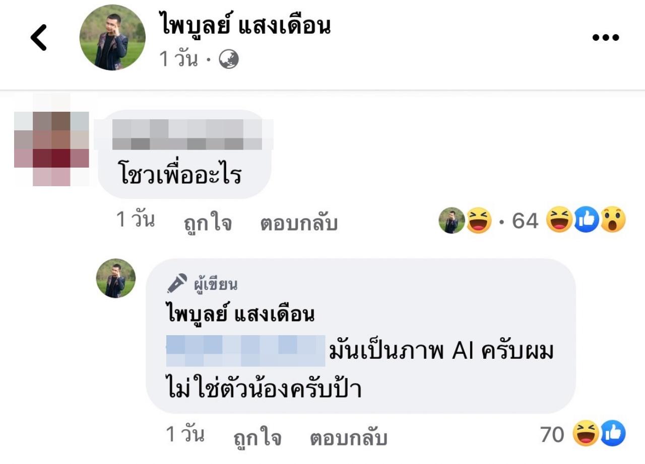 แต่งานนี้ก็มีชาวเน็ตรายหนึ่งได้เข้ามาคอมเมนต์ตามครูไพบูลย์ว่า "โชว์เพื่ออะไร" ซึ่งครูไพบูลย์ก็ได้คอมเมนต์ตอบกลับว่า "มันเป็นภาพ AI ครับผม ไม่ใช่ตัวน้องครับป้า"