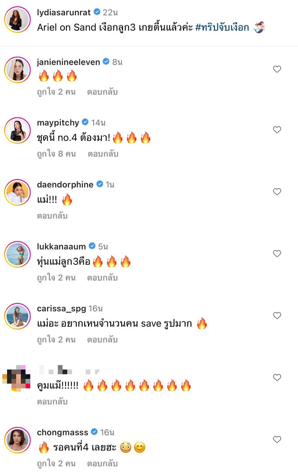 ล่าสุด แม่ลีเดีย ก็ได้โพสต์ภาพอวดหุ่นแซ่บ กับชุดทูพีซสุดเซ็กซี่ลายเปลือกหอย ยืนถ่ายสวยๆ อยู่ริมทะเลรับลมชมวิวกับบรรยากาศดีๆ พร้อมกับระบุแคปชั่นว่า "Ariel on Sand เงือกลูก 3 เกยตื้นแล้วค่ะ #ทริปจับเงือก"