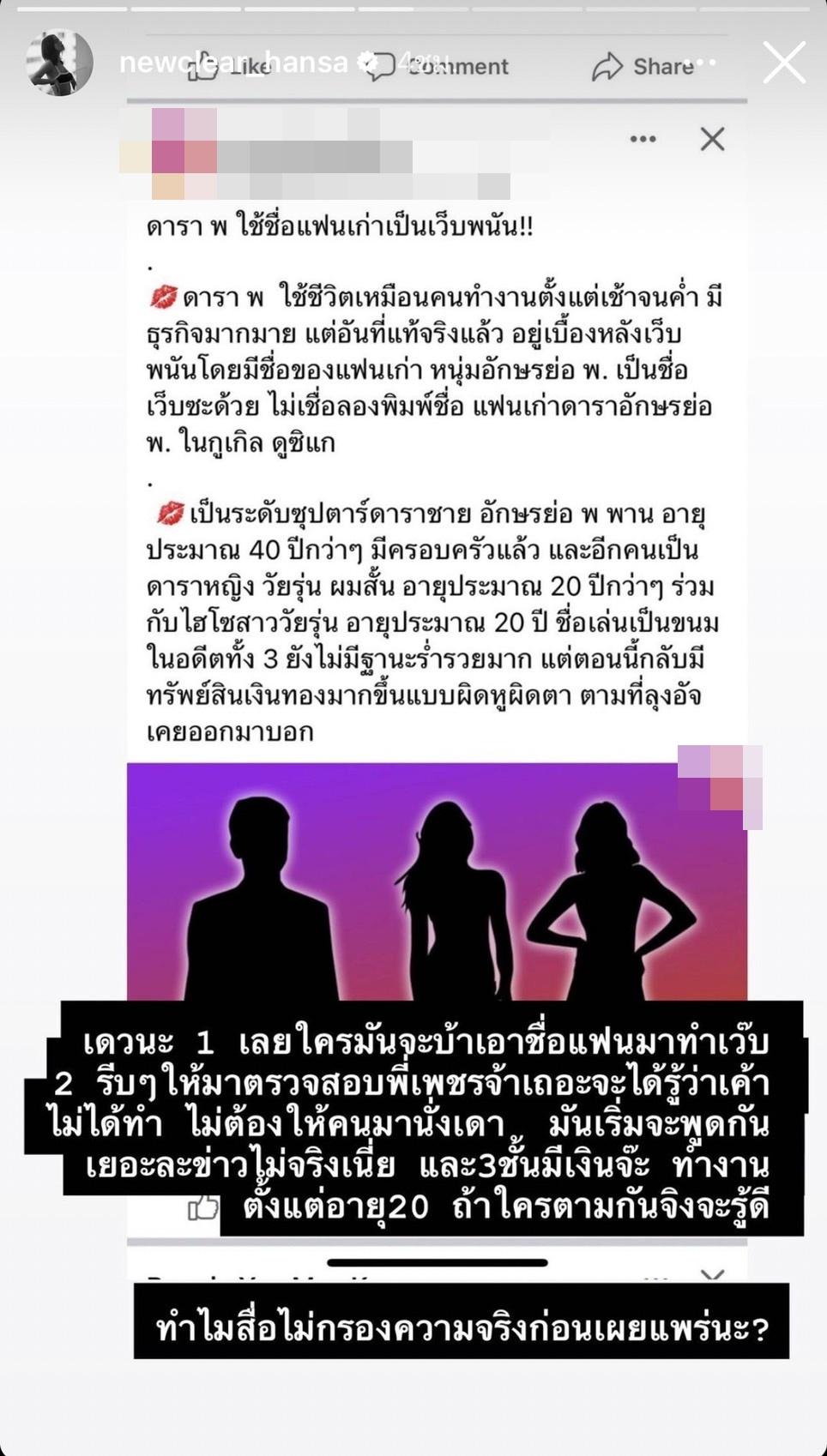 "เดี๋ยวนะ 1 เลยใครมันจะบ้าเอาเชื่อแฟนเก่ามาทำเว็บ 2 รีบๆ ให้มาตรวจสอบพี่เพชรจ้าเถอะจะได้รู้ว่าเค้าไม่ได้ทำ ไม่ต้องให้คนมานั่งเดา มันเริ่มจะพูดกันเยอะละข่าวไม่จริงเนี่ย และ 3 ชั้นมีเงินจ้ะ ทำงานตั้งแต่อายุ 20 ถ้าใครตามกันจริงจะรู้ดี ทำไมสื่อไม่กรองความจริงก่อนเผยแพร่นะ?"