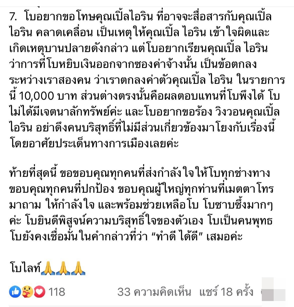7. โบอยากขอโทษคุณเปิ้ล ไอริณ ที่อาจจะสื่อสารกับคุณเปิ้ล ไอริณ คลาดเคลื่อน เป็นเหตุให้คุณเปิ้ล ไอริณ เข้าใจผิดและเกิดเหตุบานปลายดังกล่าว แต่โบอยากเรียนคุณเปิ้ล ไอริณ ว่าการที่โบหยิบเงินออกจากซองค่าจ้างนั้น เป็นข้อตกลงระหว่างเราสองคน ว่าเราตกลงค่าตัวคุณเปิ้ล ไอริณ ในรายการนี้ 10,000 บาท ส่วนต่างตรงนั้นคือผลตอบแทนที่โบพึงได้ โบไม่ได้มีเจตนาลักทรัพย์ค่ะ