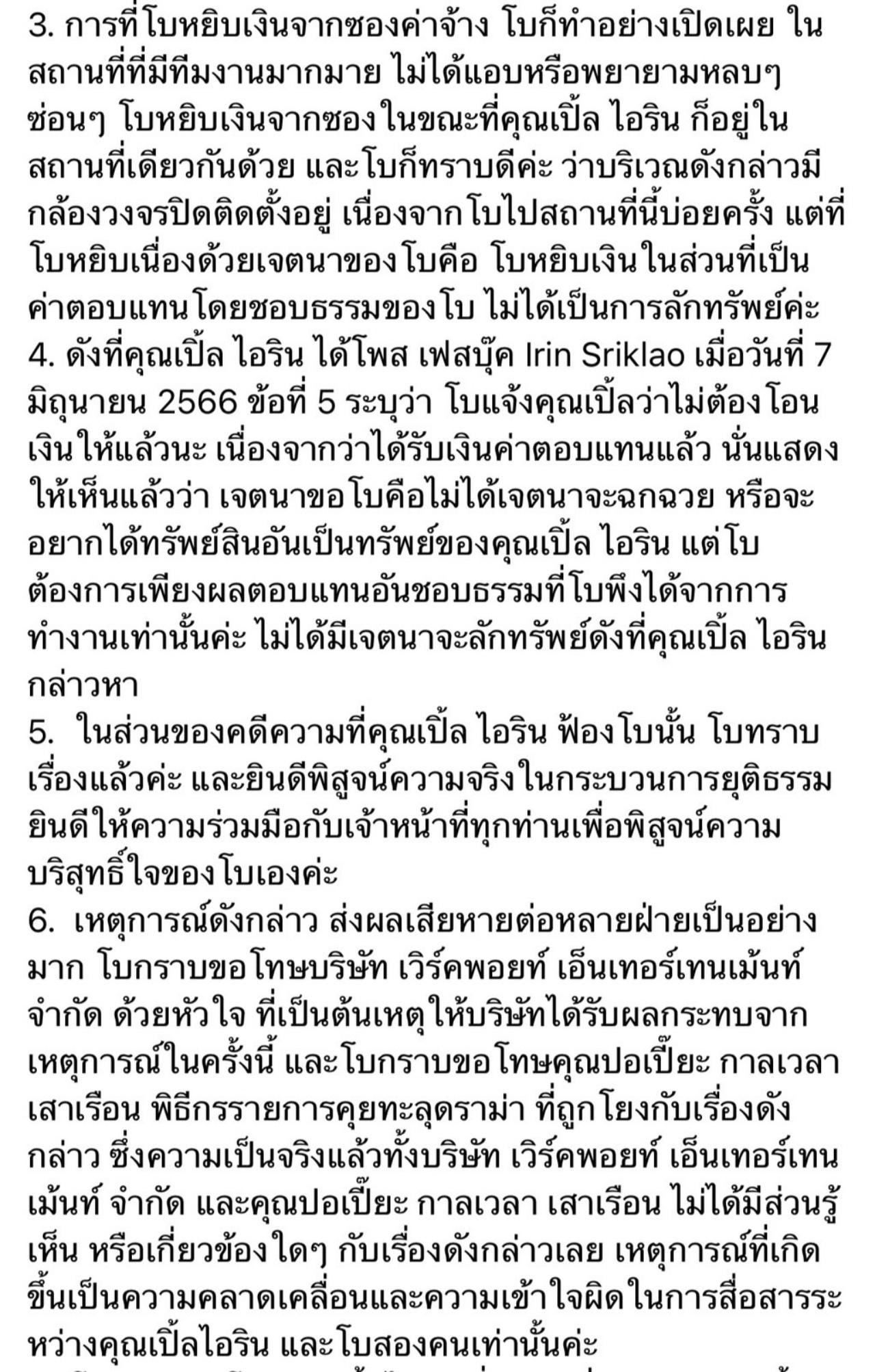 4. ดังที่คุณเปิ้ล ไอริณ ได้โพสต์ เฟซบุ๊ก Irin Sriklao เมื่อวันที่ 7 มิถุนายน 2566 ข้อที่ 5 ระบุว่า โบแจ้งคุณเปิ้ลว่าไม่ต้องโอนเงินให้แล้วนะ เนื่องจากว่าได้รับเงินค่าตอบแทนแล้ว นั่นแสดงให้เห็นแล้วว่า เจตนาขอโบคือไม่ได้เจตนาจะฉกฉวย หรือจะอยากได้ทรัพย์สินอันเป็นทรัพย์ของคุณเปิ้ล ไอริณ แต่โบต้องการเพียงผลตอบแทนอันชอบธรรมที่โบพึงได้จากการทำงานเท่านั้นค่ะ ไม่ได้มีเจตนาจะลักทรัพย์ดังที่คุณเปิ้ล ไอริณ กล่าวหา