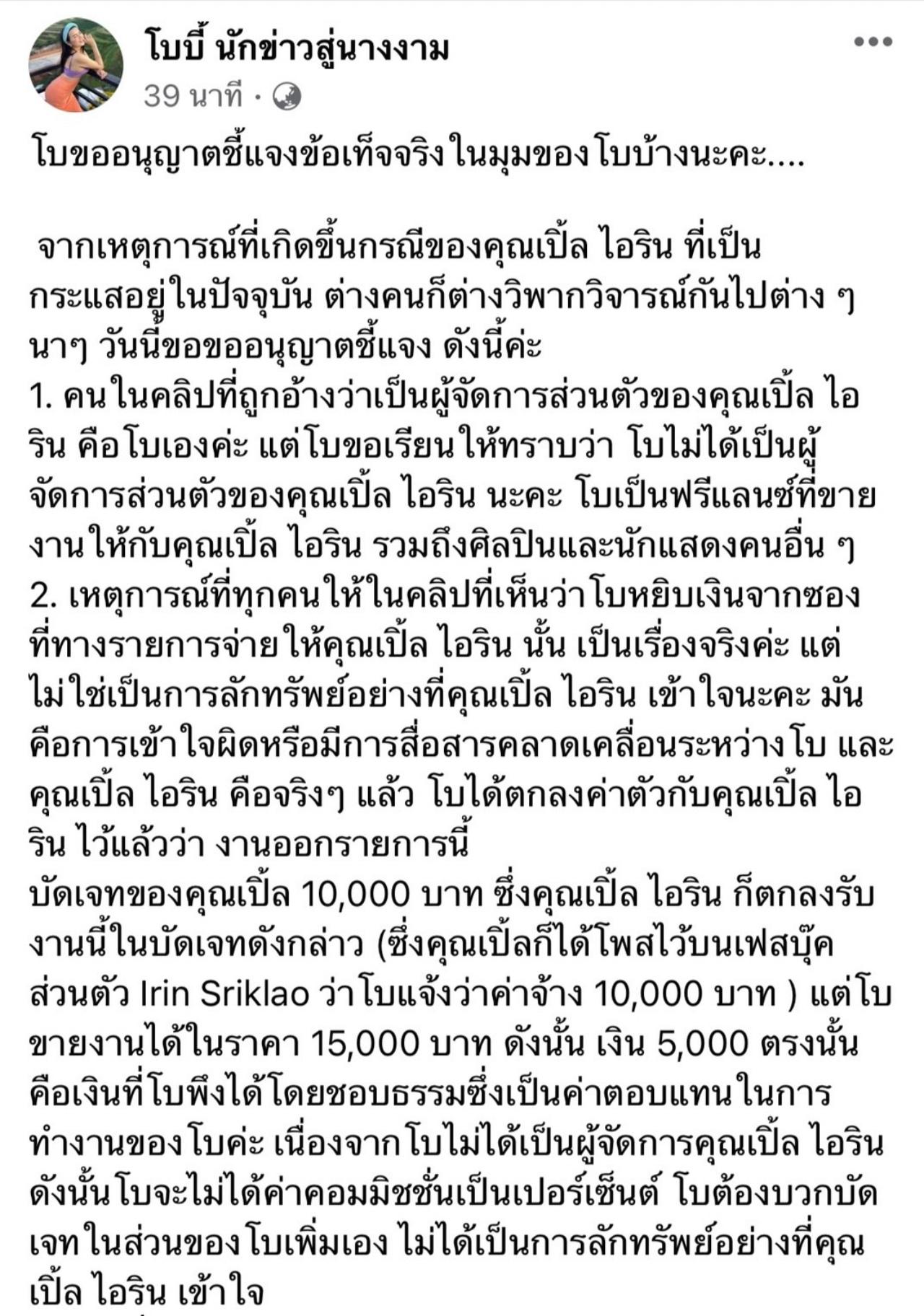 "โบขออนุญาตชี้แจงข้อเท็จจริงในมุมของโบบ้างนะคะ.... จากเหตุการณ์ที่เกิดขึ้นกรณีของคุณเปิ้ล ไอริณ ที่เป็น