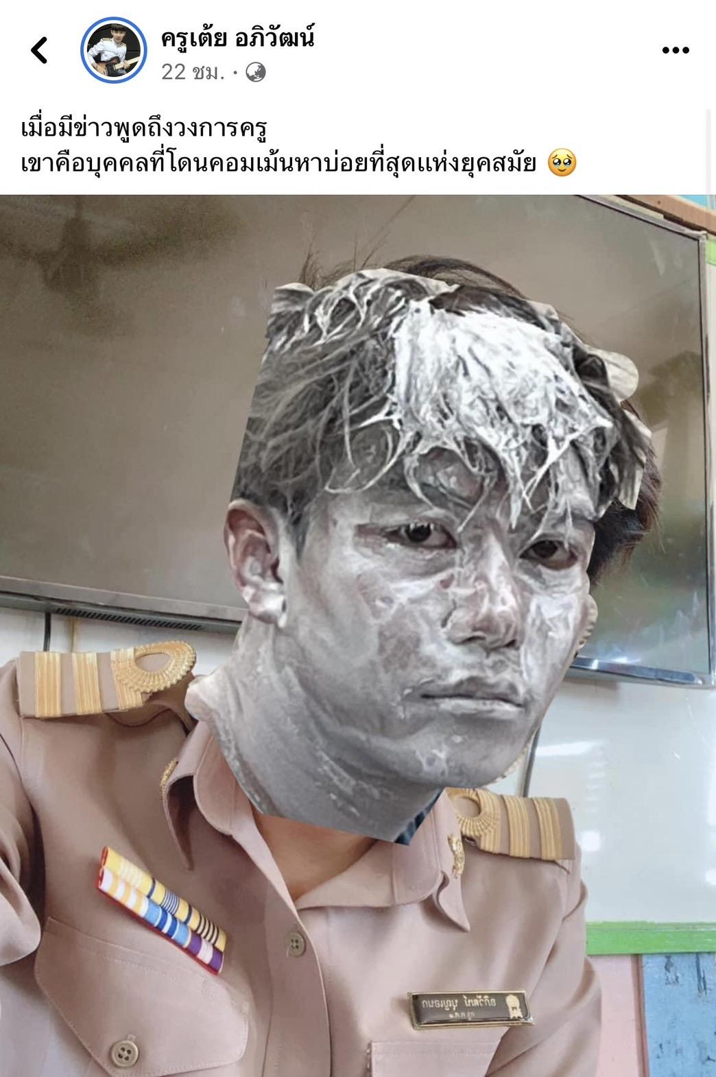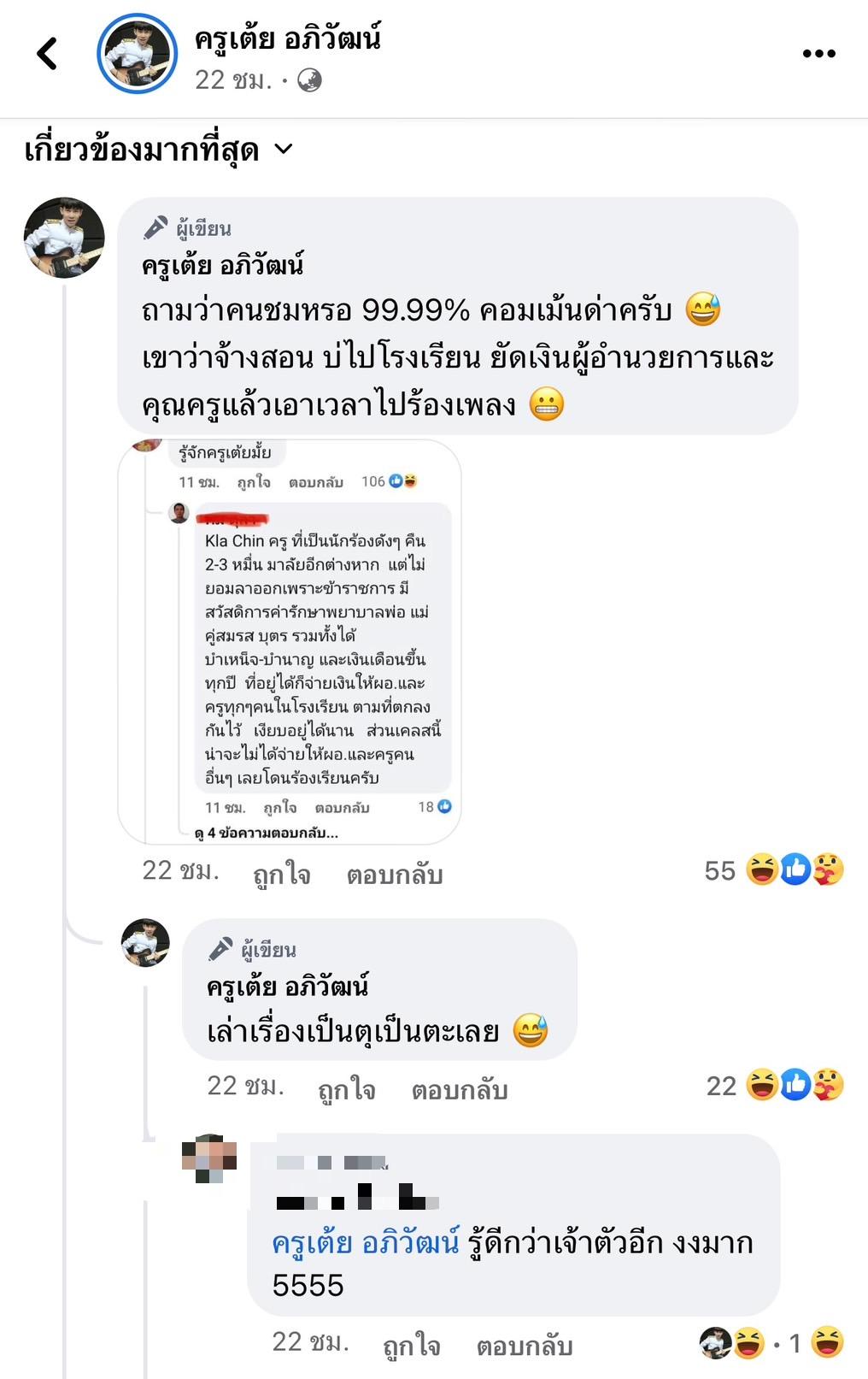 นอกจากนี้ ครูเต้ย ยังคอมเมนต์ใต้โพสต์ตัวเองอีกด้วยว่า "ถามว่าคนชมหรอ 99.99% คอมเมนต์ด่าครับ เขาว่าจ้างสอน บ่ไปโรงเรียน ยัดเงินผู้อำนวยการและคุณครูแล้วเอาเวลาไปร้องเพลง" และครูเต้ยก็ได้แคปคอมเมนต์ดังกล่าว