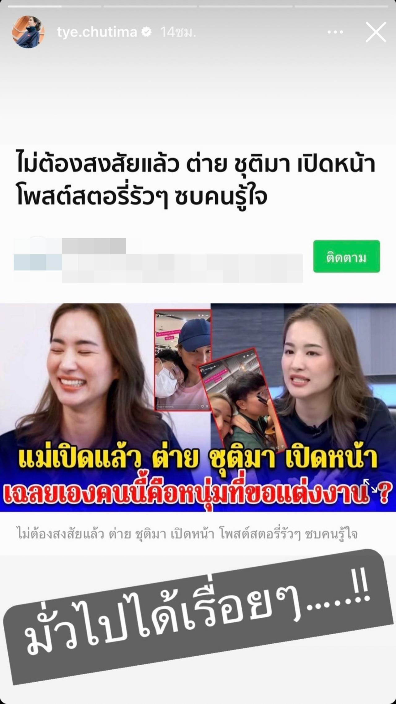 งานนี้ ต่าย ชุติมา ได้แคปข่าวและนำมาโพสต์ลงในไอจีสตอรี่ของตัวเอง พร้อมกับเขียนข้อความฟาดเบาๆ ว่า "มั่วไปได้เรื่อยๆ......!!" เรียกว่าเคลียร์ชัดว่าคนที่อยู่ในไอจีสตอรี่ของต่ายนั้นไม่ใช่คนรู้ใจของเจ้าตัวอย่างแน่นอน