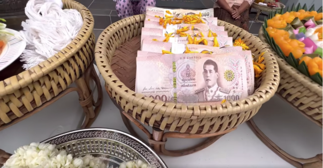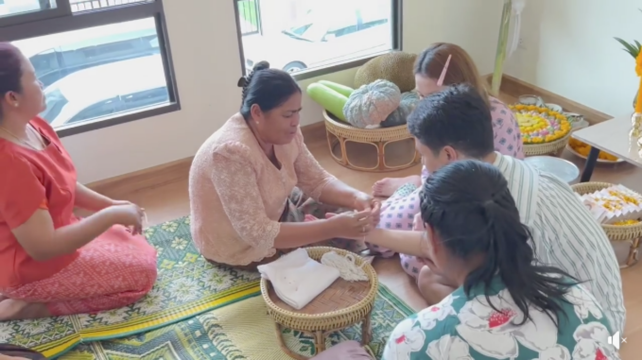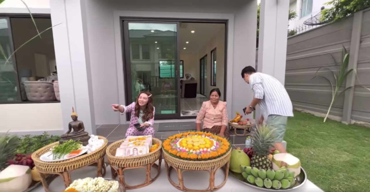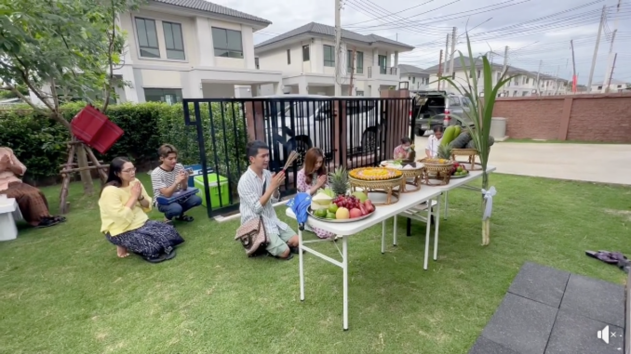 ซึ่งบรรยากาศในการเข้าอยู่บ้านใหม่มีครอบครัวมาร่วมยินดีกับทั้งคู่ ซึ่งไม่ได้มีการจัดงานใหญ่โตแต่อย่างใด แต่จัดหนักจัดเต็มที่โต๊ะบวงสรวง มีทั้งเงินสดปึกใหญ่เต็มตะกร้า และยังมีผลไม้มงคล ขนมมงคล ที่เตรียมจะขนเข้าบ้านอีกด้วย