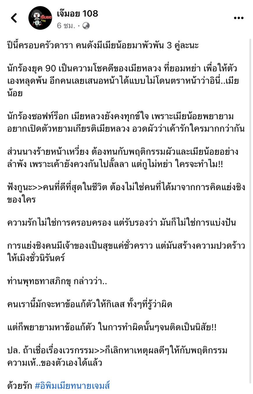 ปีนี้เรียกว่าทำเอาวงการบันเทิงต้องสั่นสะเทือน หลังจากเพจดัง เจ๊มอย 108 ได้โพสต์เฟซบุ๊กบอกว่า "ปีนี้ครอบครัวดารา คนดังมีเมียน้อยมาพัวพัน 3 คู่ละนะ