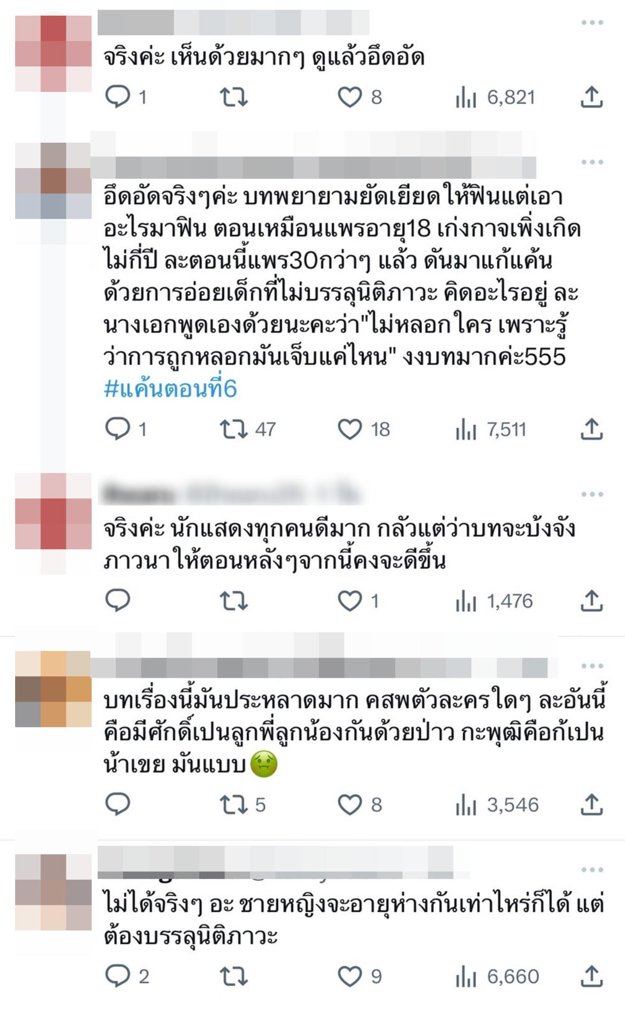 จากนั้นก็มีผู้ใช้ทวิตเตอร์คนอื่นๆ เข้ามาวิจารณ์แสดงความคิดเห็นว่า "จริงค่ะ เห็นด้วยมากๆ ดูแล้วอึดอัด, อึดอัดจริงๆค่ะ บทพยายามยัดเยียดให้ฟินแต่เอาอะไรมาฟิน ตอนเหมือนแพรอายุ 18 เก่งกาจเพิ่งเกิดไม่กี่ปี ละตอนนี้แพร 30 กว่าๆ แล้ว ดันมาแก้แค้นด้วยการอ่อยเด็กที่ไม่บรรลุนิติภาวะ คิดอะไรอยู่ ละนางเอกพูดเองด้วยนะคะว่า "ไม่หลอกใคร เพราะรู้ว่าการถูกหลอกมันเจ็บแค่ไหน" งงบทมากค่ะ555 #แค้นตอนที่6, บทเรื่องนี้มันประหลาดมาก คสพตัวละครใดๆ ละอันนี้คือมีศักดิ์เป็นลูกพี่ลูกน้องกันด้วยป่าว กะพุฒิคือก็เป็นน้าเขย มันแบบ"