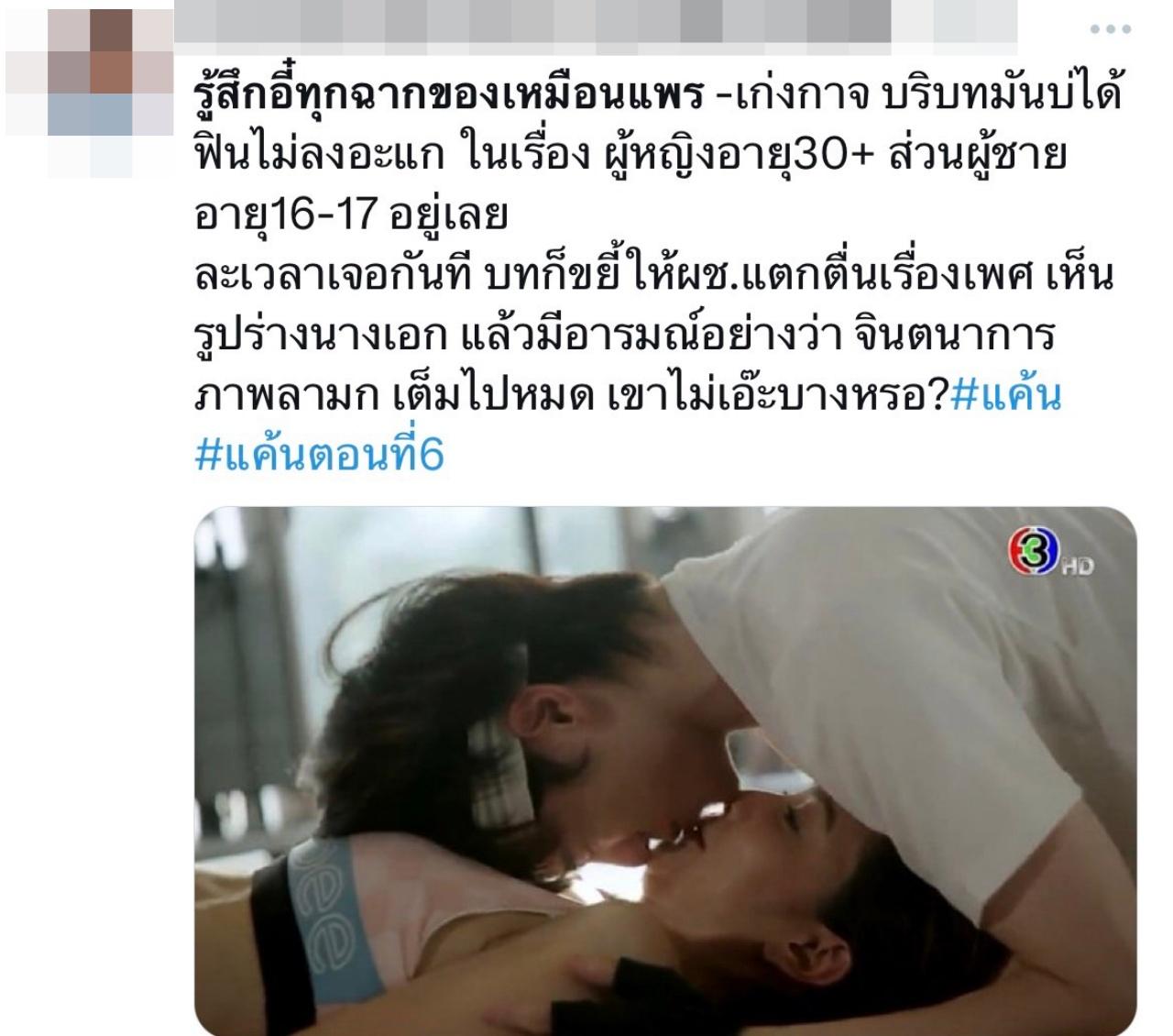 "รู้สึกอี๋ทุกฉากของเหมือนแพร-เก่งกาจ บริบทมันบ่ได้ ฟินไม่ลงอะแก ในเรื่อง ผู้หญิงอายุ 30+ ส่วนผู้ชายอายุ 16-17 อยู่เลย ละเวลาเจอกันที บทก็ขยี้ให้ผช.แตกตื่นเรื่องเพศ เห็นรูปร่างนางเอก แล้วมีอารมณ์อย่างว่า จินตนาการภาพลามก เต็มไปหมด เขาไม่เอ๊ะบางหรอ? #แค้น #แค้นตอนที่6"
