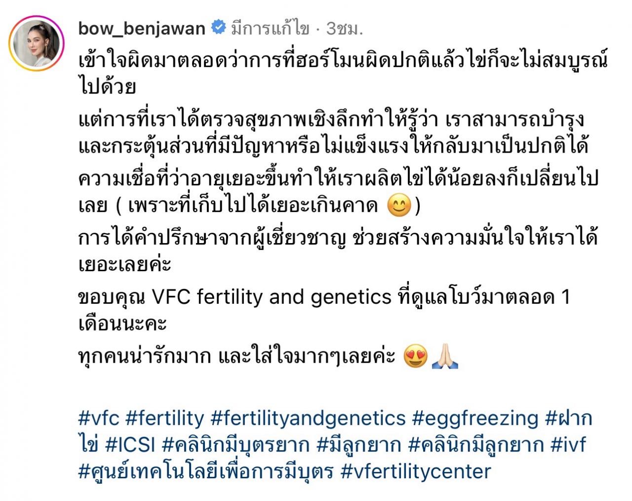 โดย สาวโบว์ ได้โพสต์คลิปผ่านอินสตาแกรมส่วนตัว และลงแคปชั่นเอาไว้ว่า "เข้าใจผิดมาตลอดว่าการที่ฮอร์โมนผิดปกติแล้วไข่ก็จะไม่สมบูรณ์ไปด้วย แต่การที่เราได้ตรวจสุขภาพเชิงลึกทำให้รู้ว่า