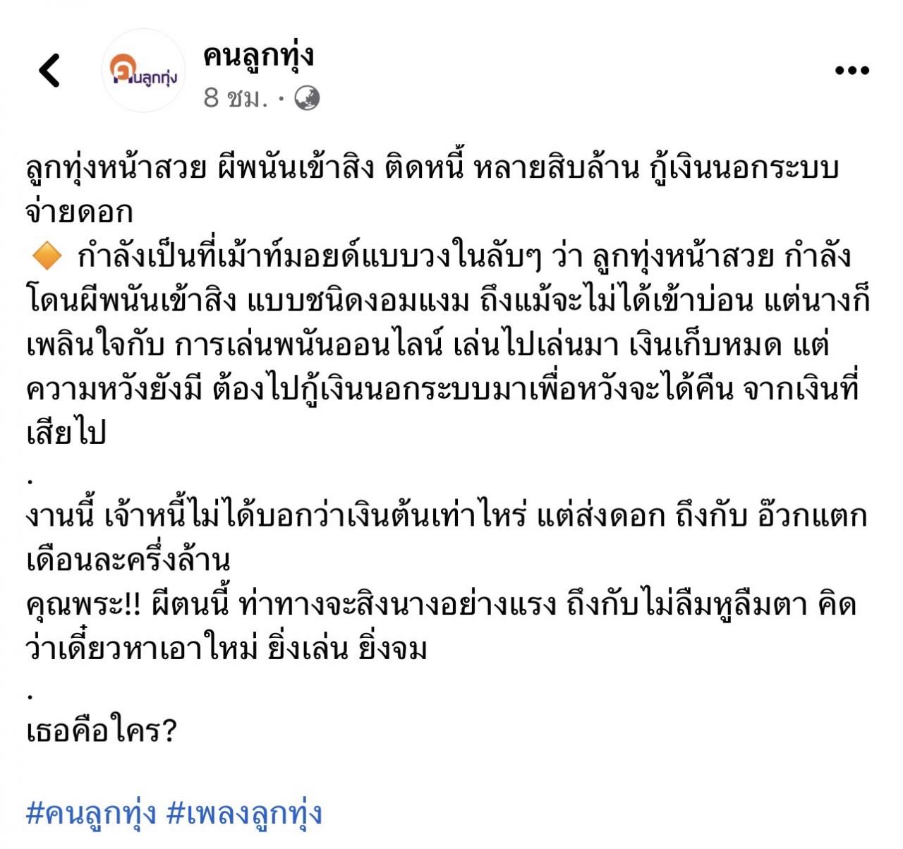 “ลูกทุ่งหน้าสวย ผีพนันเข้าสิง ติดหนี้หลายสิบล้าน กู้เงินนอกระบบจ่ายดอก กำลังเป็นที่เม้าท์มอยแบบวงในลับๆ ว่า ลูกทุ่งหน้าสวย กำลังโดนผีพนันเข้าสิง แบบชนิดงอมแงม