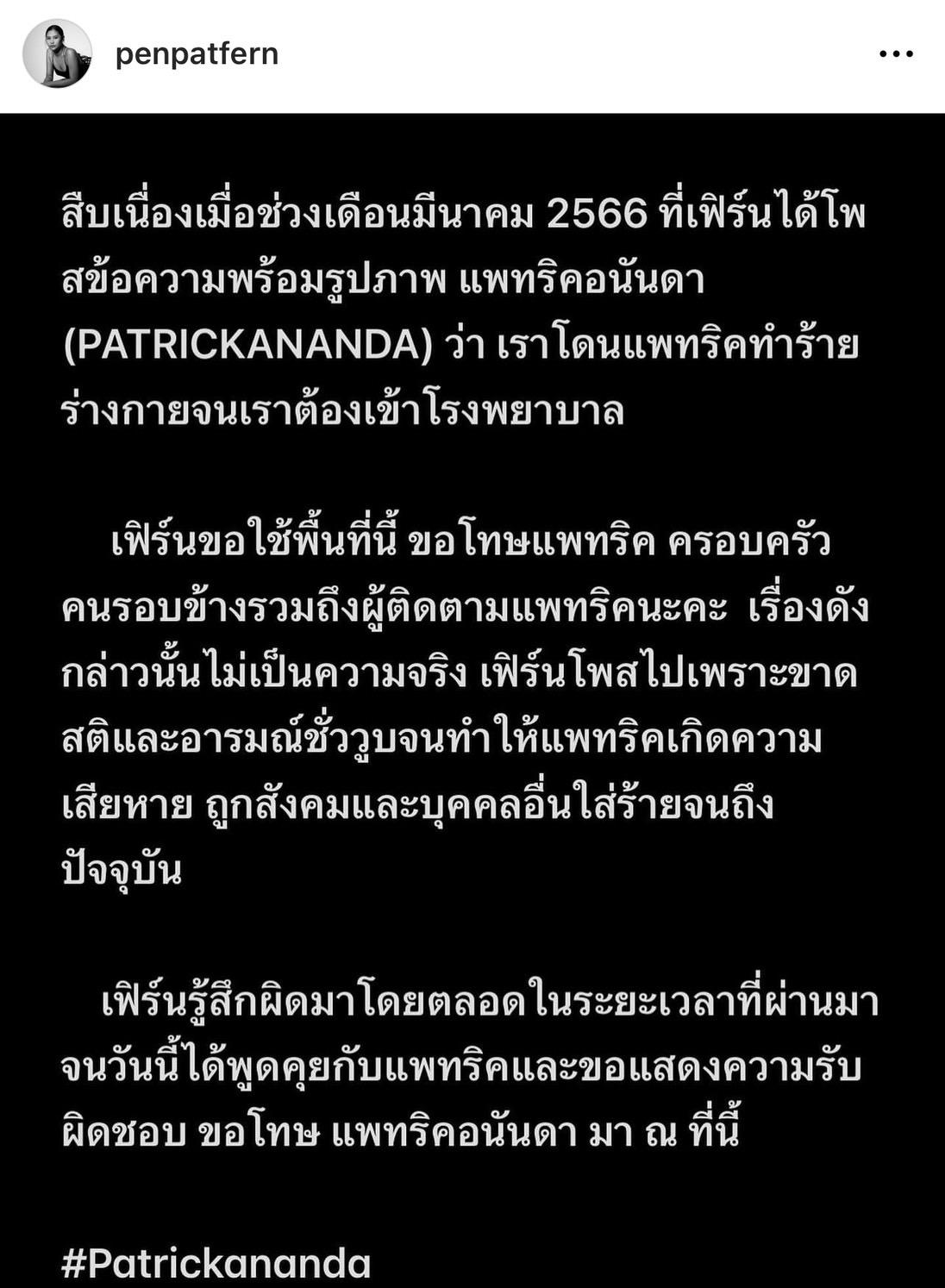 เฟิร์นรู้สึกผิดมาโดยตลอดในระยะเวลาที่ผ่านมา จนวันนี้ได้พูดคุยกับแพทริคและขอแสดงความรับผิดชอบ ขอโทษ แพทริคอนันดา มา ณ ที่นี้ #Patrickananda" พร้อมแคปชั่นระบุว่า "#patrickananda".