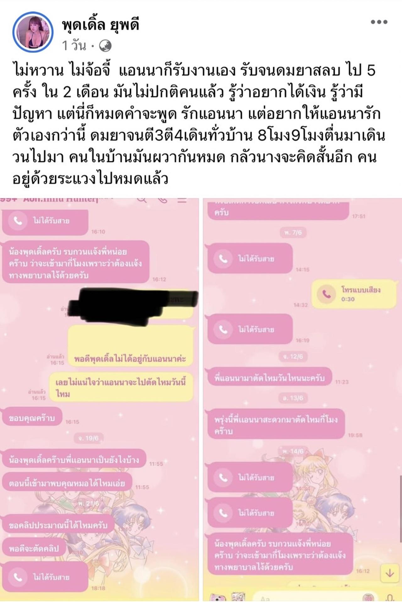 จากนั้นก็เขียนว่า "ไม่หวาน ไม่จ้อจี้ แอนนาก็รับงานเอง รับจนดมยาสลบไป 5 ครั้ง ใน 2 เดือน มันไม่ปกติคนแล้ว รู้ว่าอยากได้เงิน รู้ว่ามีปัญหา แต่นี่ก็หมดคำจะพูด รักแอนนา แต่อยากให้แอนนารักตัวเองกว่านี้ ดมยาจนตี3 ตี4 เดินทั่วบ้าน 8 โมง 9 โมง ตื่นมาเดินวนไปมา คนในบ้านมันผวากันหมด กลัวนางจะคิดสั้นอีก คนอยู่ด้วยระแวงไปหมดแล้ว"