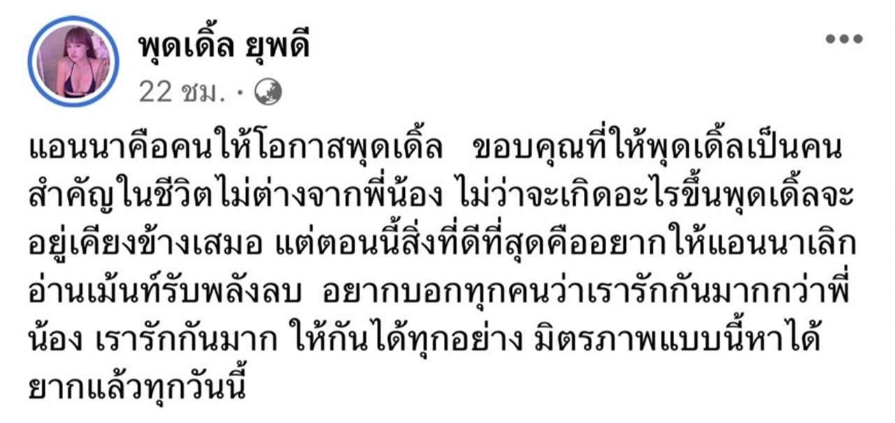และยังบอกอีกว่า ไม่ว่าจะยังไงก็จะอยู่เคียงข้าง แอนนา เสมอ "แอนนาคือคนให้โอกาสพุดเดิ้ล ขอบคุณที่ให้พุดเดิ้ลเป็นคนสำคัญในชีวิตไม่ต่างจากพี่น้อง ไม่ว่าจะเกิดอะไรขึ้นพุดเดิ้ลจะอยู่เคียงข้างเสมอ แต่ตอนนี้สิ่งที่ดีที่สุดคืออยากให้แอนนาเลิกอ่านเมนต์รับพลังลบ อยากบอกทุกคนว่าเรารักกันมากกว่าพี่น้อง เรารักกันมาก ให้กันได้ทุกอย่าง มิตรภาพแบบนี้หาได้ยากแล้วทุกวันนี้"