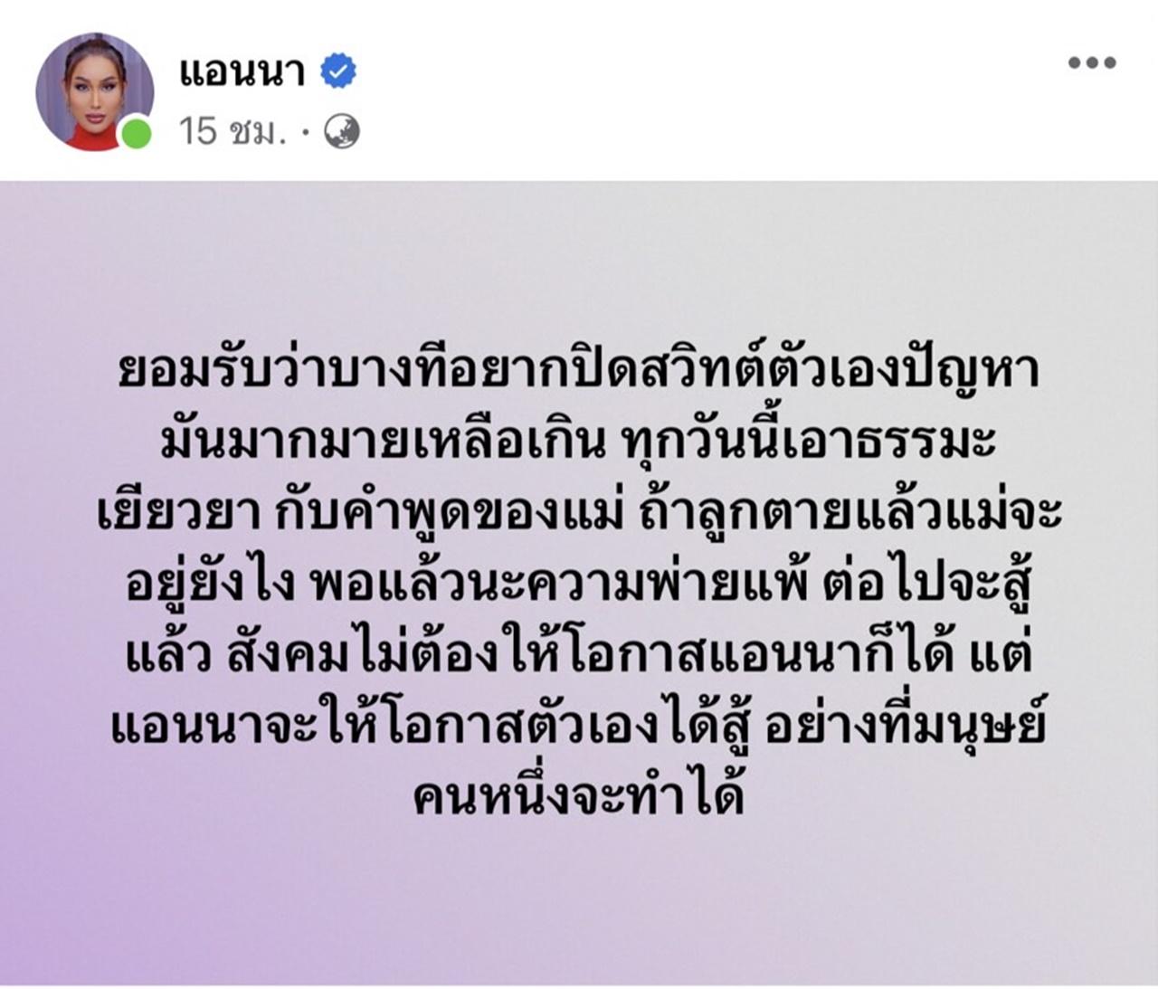 ในเวลาต่อมา แอนนา ได้โพสต์ข้อความว่า "ยอมรับว่าบางทีอยากปิดสวิตช์ตัวเอง ปัญหามันมากมายเหลือเกิน ทุกวันนี้เอาธรรมะเยียวยา กับคำพูดของแม่ ถ้าลูกตายแล้วแม่จะอยู่ยังไง พอแล้วนะความพ่ายแพ้ ต่อไปจะสู้แล้ว สังคมไม่ต้องให้โอกาสแอนนาก็ได้ แต่แอนนาจะให้โอกาสตัวเองได้สู้ อย่างที่มนุษย์คนหนึ่งจะทำได้".