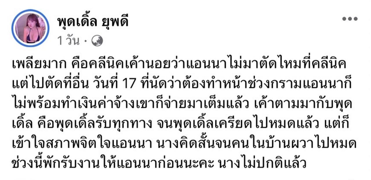 "เพลียมาก คือคลินิกเค้านอยด์ว่าแอนนาไม่มาตัดไหมที่คลินิก แต่ไปตัดที่อื่น วันที่ 17 ที่นัดว่าต้องทำหน้าช่วงกรามแอนนาก็ไม่พร้อมทำเงินค่าจ้างเขาก็จ่ายมาเต็มแล้ว เค้าตามมากับพุดเดิ้ล คือพุดเดิ้ลรับทุกทาง จนพุดเดิ้ลเครียดไปหมดแล้ว แต่ก็เข้าใจสภาพจิตใจแอนนา นางคิดสั้นจนคนในบ้านผวาไปหมด ช่วงนี้พักรับงานให้แอนนาก่อนนะคะ นางไม่ปกติแล้ว"