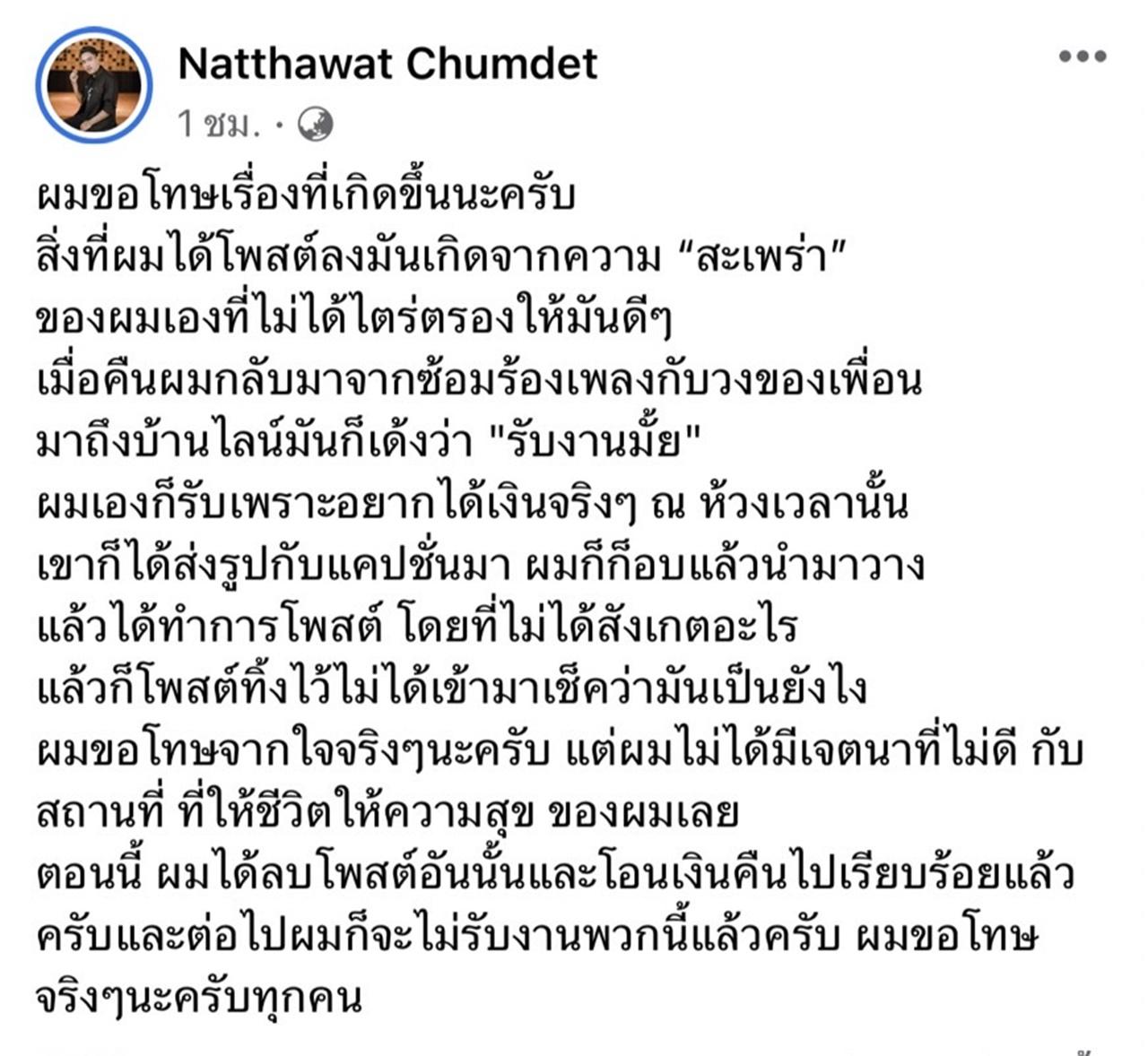 "ผมขอโทษเรื่องที่เกิดขึ้นนะครับ สิ่งที่ผมได้โพสต์ลงมันเกิดจากความ “สะเพร่า” ของผมเองที่ไม่ได้ไตร่ตรองให้มันดีๆ เมื่อคืนผมกลับมาจากซ้อมร้องเพลงกับวงของเพื่อนมาถึงบ้านไลน์มันก็เด้งว่า “รับงานมั้ย”