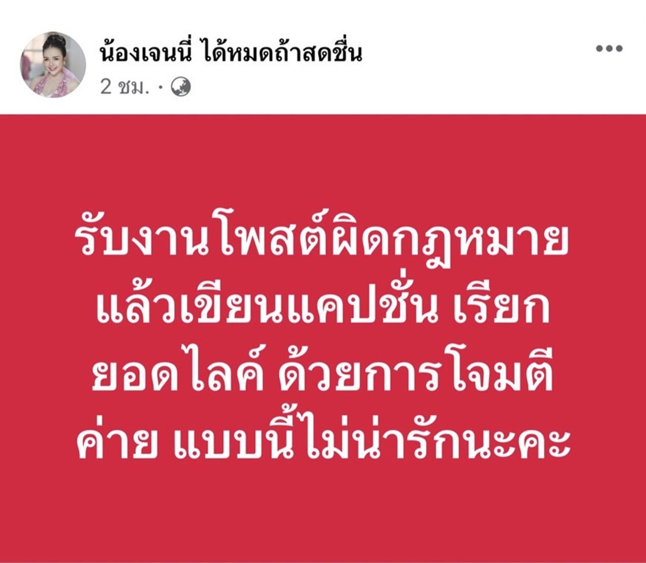 หลังจากที่ก่อนหน้านี้ เจนนี่ ได้หมดถ้าสดชื่น หรือเจนนี่ รัชนก สุวรรณเกตุ ได้โพสต์ฟาดเดือดถึงอดีตเด็กในค่ายได้หมดถ้าสดชื่น ที่ออกไปแล้ว แต่ไม่ได้ระบุว่าเป็นใคร โดยเขียนว่า "รับงานโพสต์ผิดกฎหมาย แล้วเขียนแคปชั่น เรียกยอดไลค์ ด้วยการโจมตีค่าย แบบนี้ไม่น่ารักนะคะ"