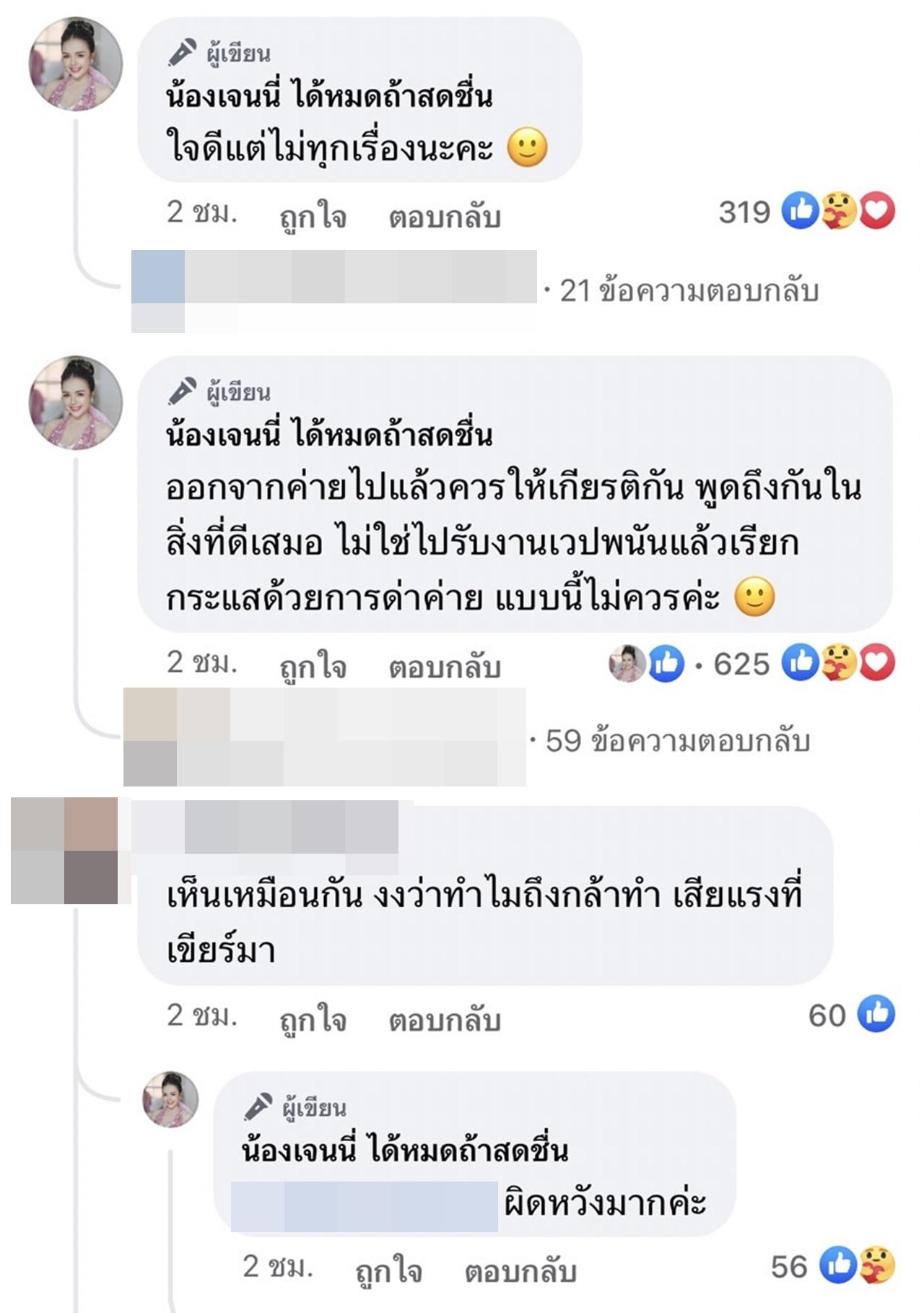 "ใจดีแต่ไม่ทุกเรื่องนะคะ ออกจากค่ายไปแล้วควรให้เกียรติกัน พูดถึงกันในสิ่งที่ดีเสมอ ไม่ใช่ไปรับงานเว็บพนันแล้วเรียกกระแสด้วยการด่าค่าย แบบนี้ไม่ควรค่ะ"