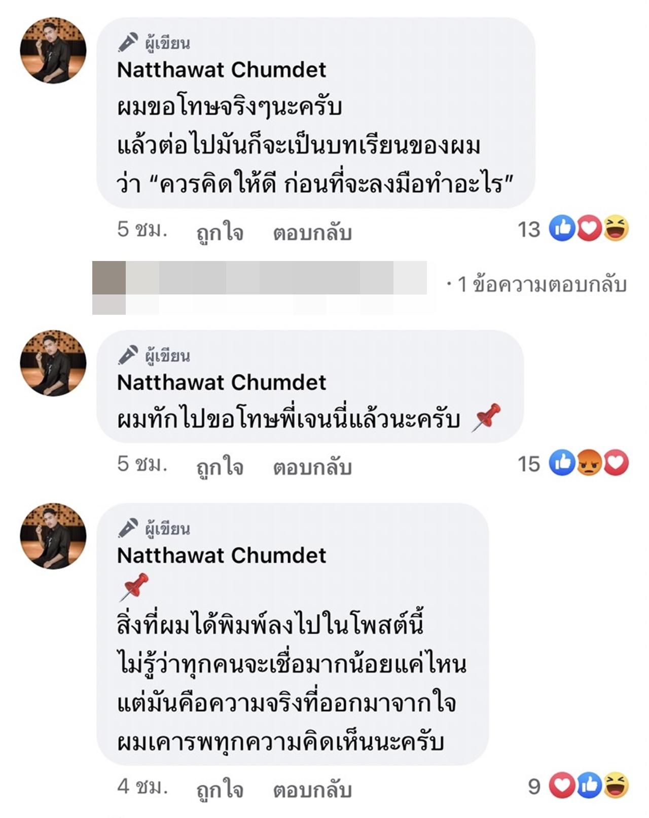และยังบอกต่ออีกว่า "แล้วต่อไปมันก็จะเป็นบทเรียนของผมว่า ควรคิดให้ดี ก่อนที่จะลงมือทำอะไร ผมทักไปขอโทษพี่เจนนี่แล้วนะครับ สิ่งที่ผมได้พิมพ์ลงไปในโพสต์นี้ ไม่รู้ว่าทุกคนจะเชื่อมากน้อยแค่ไหน แต่มันคือความจริงที่ออกมาจากใจ ผมเคารพทุกความคิดเห็นนะครับ".
