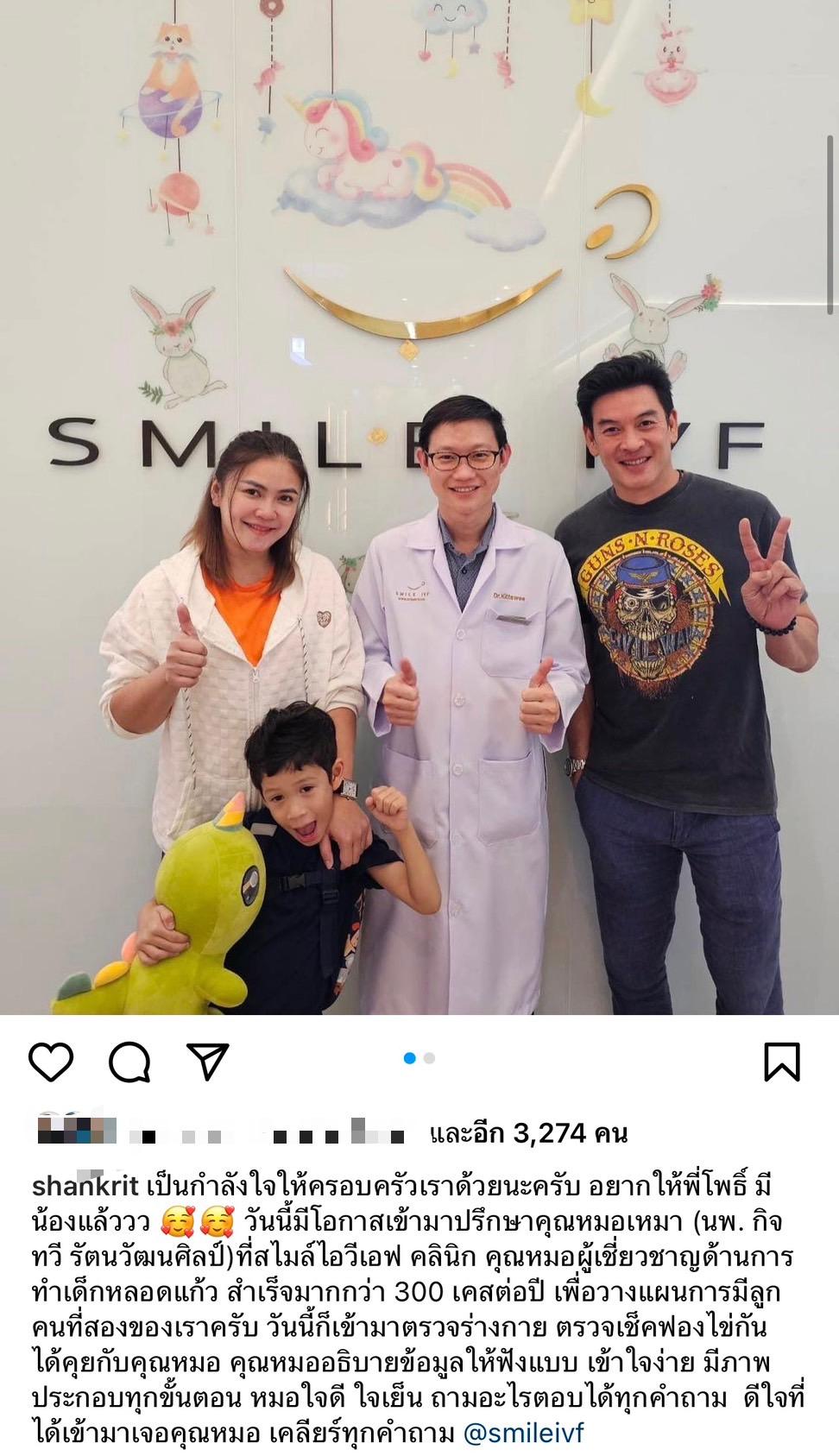 โดยระบุข้อความว่า “เป็นกำลังใจให้ครอบครัวเราด้วยนะครับ อยากให้พี่โพธิ์ มีน้องแล้ววว วันนี้มีโอกาสเข้ามาปรึกษาคุณหมอเหมา (นพ.กิจทวี รัตนวัฒนศิลป์) ที่สไมล์ไอวีเอฟ คลินิก คุณหมอผู้เชี่ยวชาญด้านการทำเด็กหลอดแก้ว สำเร็จมากกว่า 300 เคสต่อปี เพื่อวางแผนการมีลูกคนที่สองของเราครับ