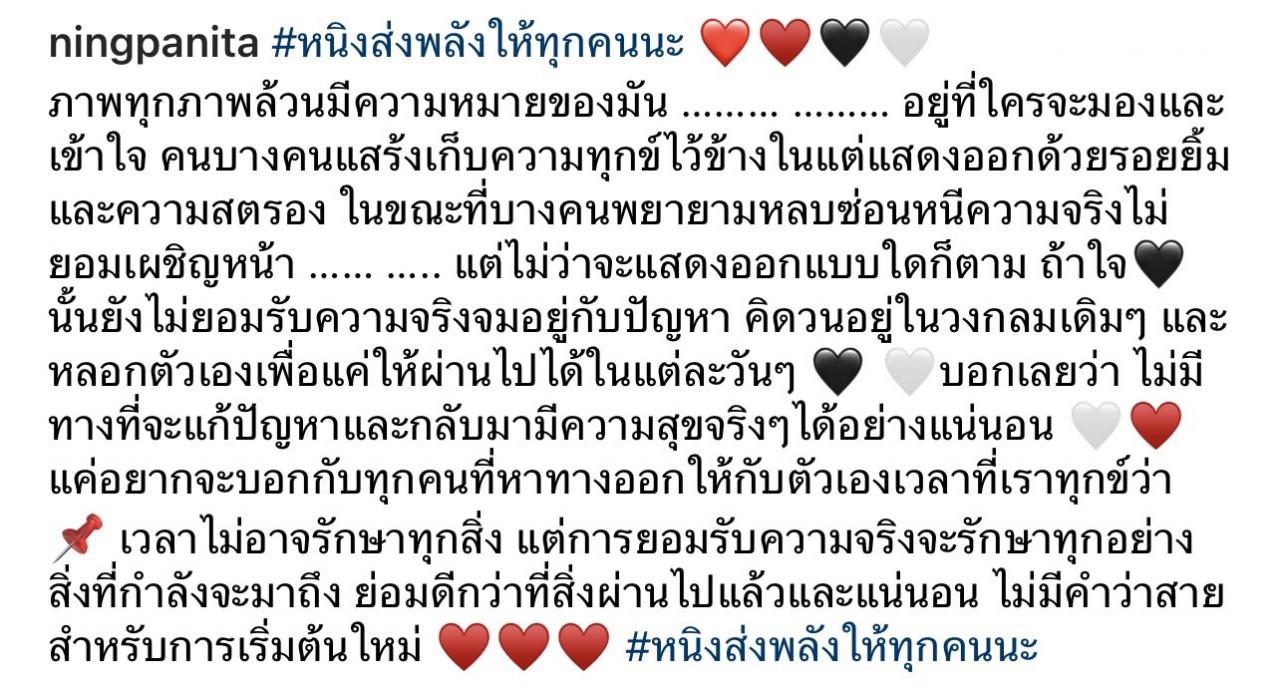 โดยระบุข้อความว่า "#หนิงส่งพลังให้ทุกคนนะ ภาพทุกภาพล้วนมีความหมายของมัน อยู่ที่ใครจะมองและเข้าใจ คนบางคนแสร้งเก็บความทุกข์ไว้ข้างในแต่แสดงออกด้วยรอยยิ้มและความสตรอง
