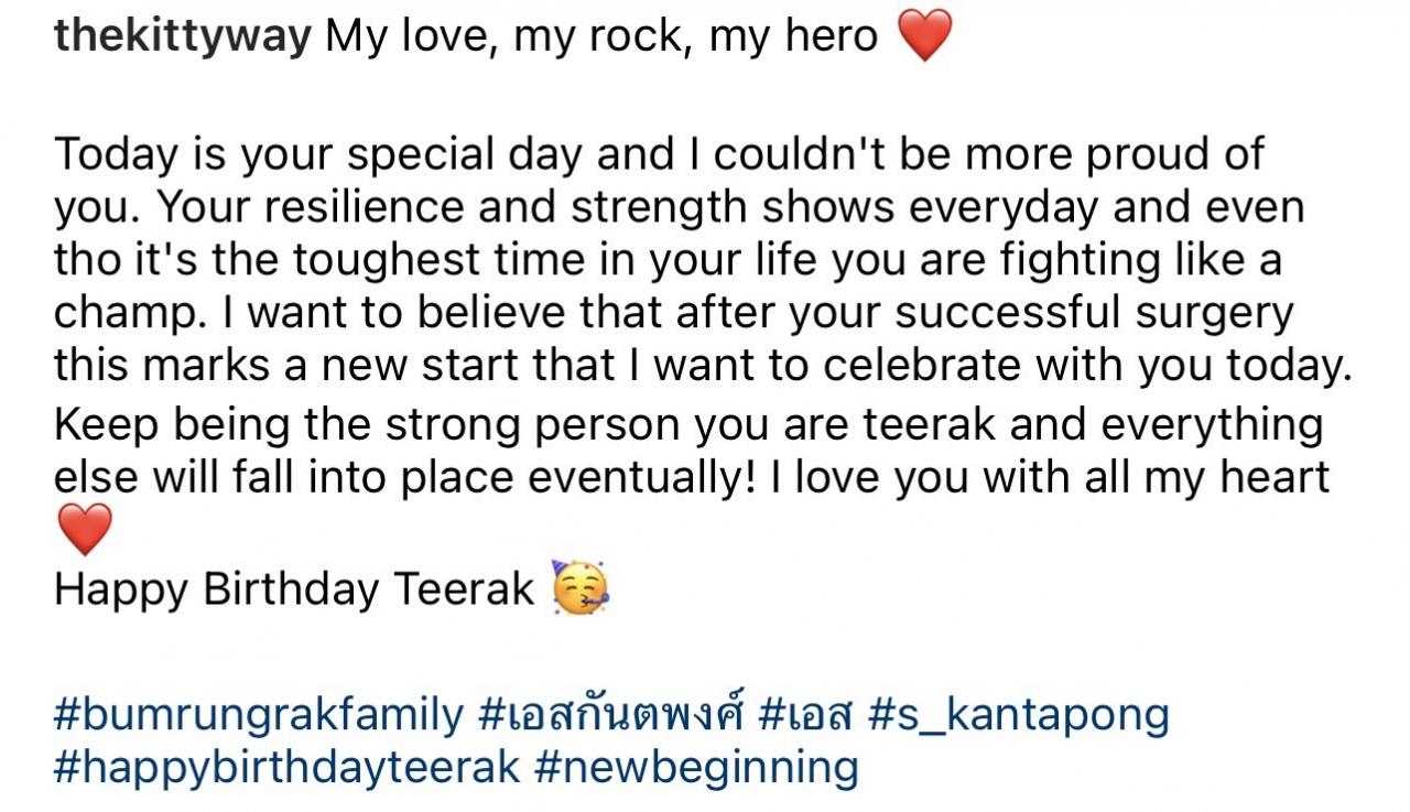 ฉันเชื่อว่าหลังจากการผ่าตัดที่ประสบความสำเร็จ นี่เป็นการเริ่มต้นใหม่ที่ฉันอยากจะเฉลิมฉลองร่วมกับคุณในวันนี้ จงเป็นคนที่เข้มแข็งต่อไป หวังว่าทุกอย่างจะเข้าที่เข้าทางในที่สุด! ฉันรักคุณหมดหัวใจ สุขสันต์วันเกิด..ที่รัก".