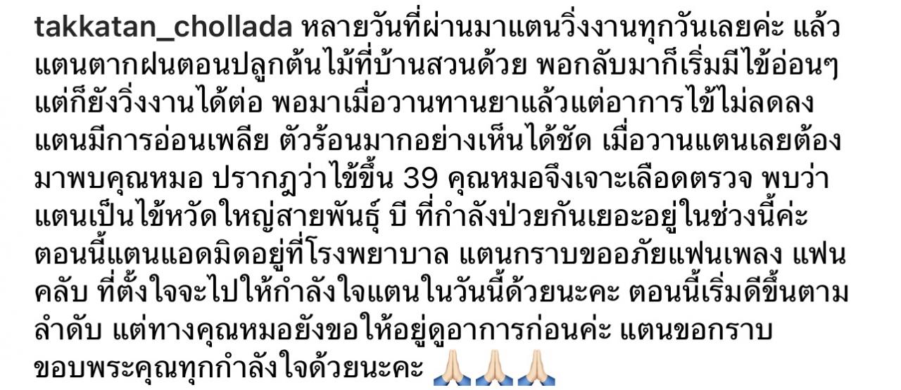 โดยเขียนแคปชั่นระบุว่า “หลายวันที่ผ่านมาแตนวิ่งงานทุกวันเลยค่ะ แล้วแตนตากฝนตอนปลูกต้นไม้ที่บ้านสวนด้วย พอกลับมาก็เริ่มมีไข้อ่อนๆ แต่ก็ยังวิ่งงานได้ต่อ พอมาเมื่อวานทานยาแล้วแต่อาการไข้ไม่ลดลง แตนมีการอ่อนเพลีย ตัวร้อนมากอย่างเห็นได้ชัด