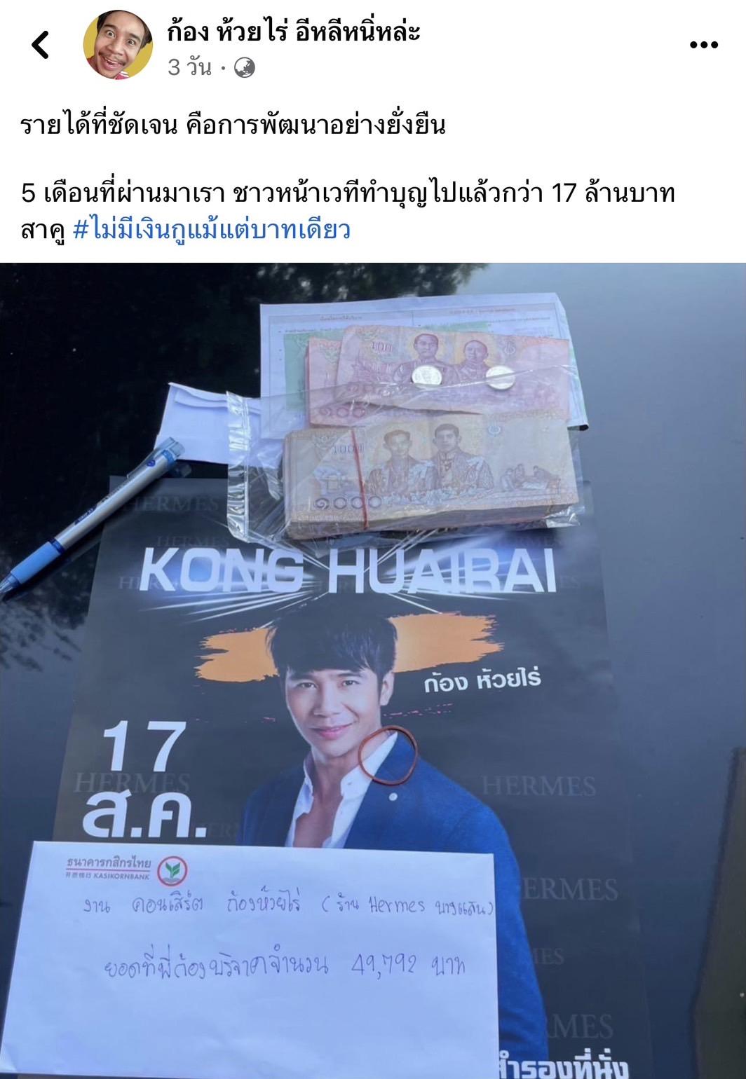 ทำเอาโลกโซเชียลฮือฮาหนักมากหลัง นักร้องหนุ่ม ก้อง ห้วยไร่ ได้โพสต์รูปภาพพร้อมข้อความว่า "รายได้ที่ชัดเจน คือการพัฒนาอย่างยั่งยืน 5 เดือนที่ผ่านมาเรา ชาวหน้าเวทีทำบุญไปแล้วกว่า 17 ล้านบาท สาคู #ไม่มีเงินกูแม้แต่บาทเดียว"