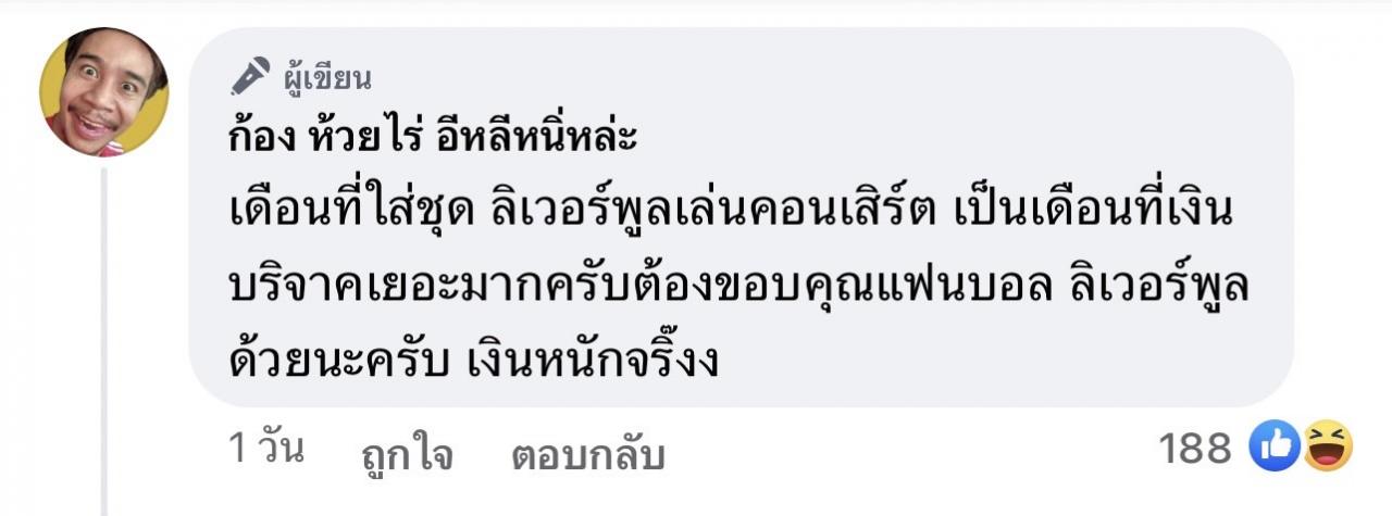 อีกทั้งยังคอมเมนต์เพิ่มเติมใต้โพสต์ดังกล่าวอีกว่า "เดือนที่ใส่ชุดลิเวอร์พูลเล่นคอนเสิร์ต เป็นเดือนที่เงินบริจาคเยอะมากครับ ต้องขอบคุณแฟนบอลลิเวอร์พูลด้วยนะครับเงินหนักจริ๊งง"