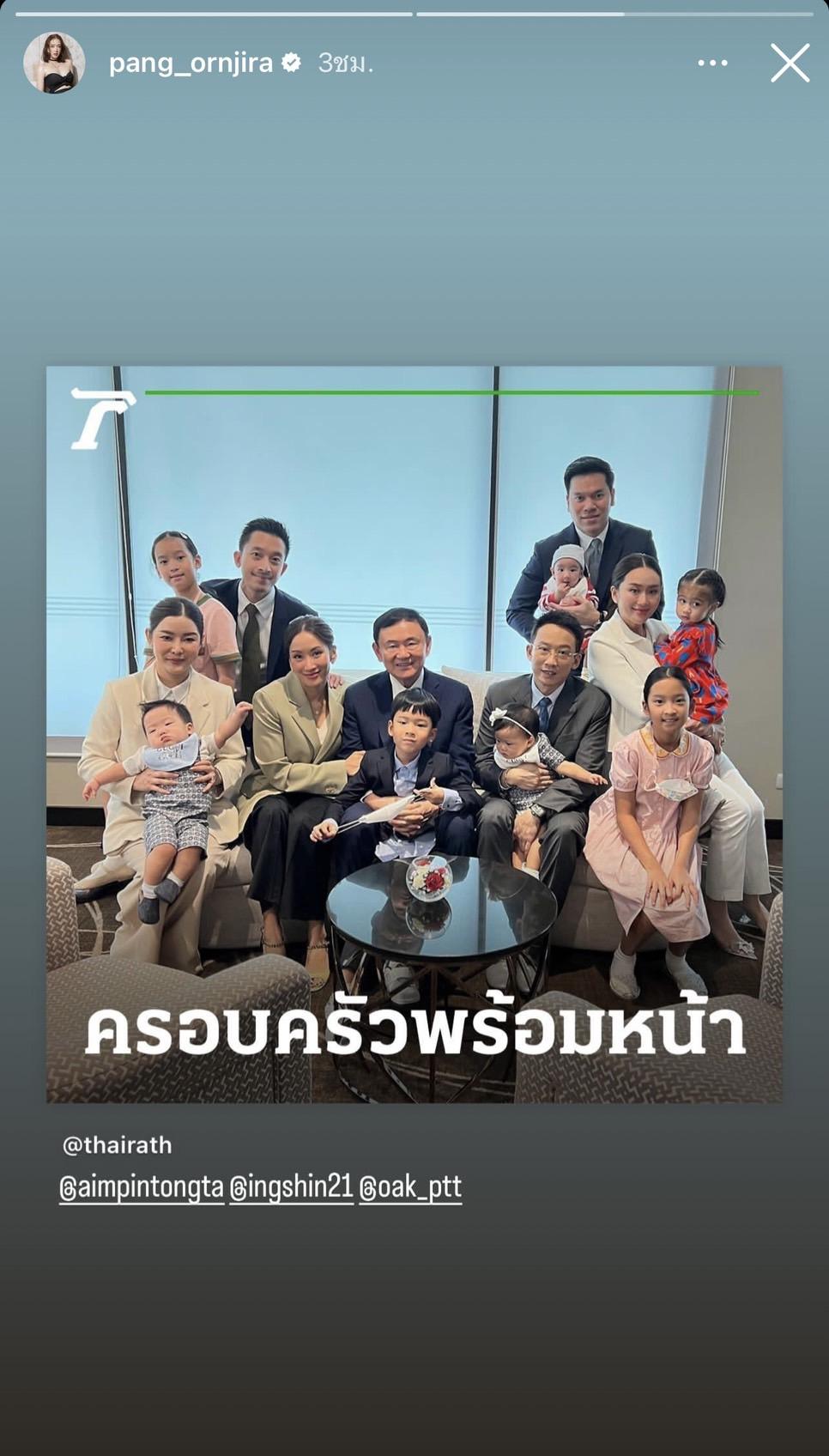 และยังแชร์ภาพข่าว อิ๊งค์ โพสต์ภาพคุณพ่ออยู่พร้อมหน้าครอบครัว และแท็กหา โอ๊ค พานทองแท้, เอม พินทองทา และ อิ๊งค์ แพทองธาร
