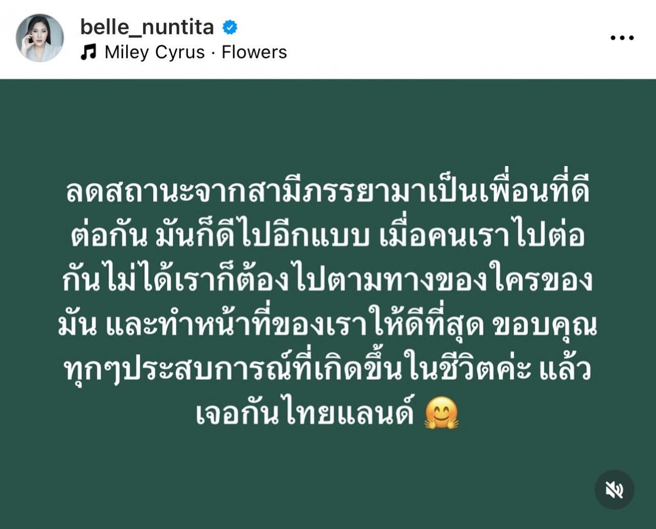 โดย สาวเบลล์ ได้โพสต์ข้อความผ่านทางอินสตาแกรมส่วนตัว ระบุว่า "ลดสถานะจากสามีภรรยามาเป็นเพื่อนที่ดีต่อกัน มันก็ดีไปอีกแบบ เมื่อคนเราไปต่อกันไม่ได้ เราก็ต้องไปตามทางของใครของมัน และทำหน้าที่ของเราให้ดีที่สุด ขอบคุณทุกๆ ประสบการณ์ที่เกิดขึ้นในชีวิตค่ะ แล้วเจอกันไทยแลนด์".