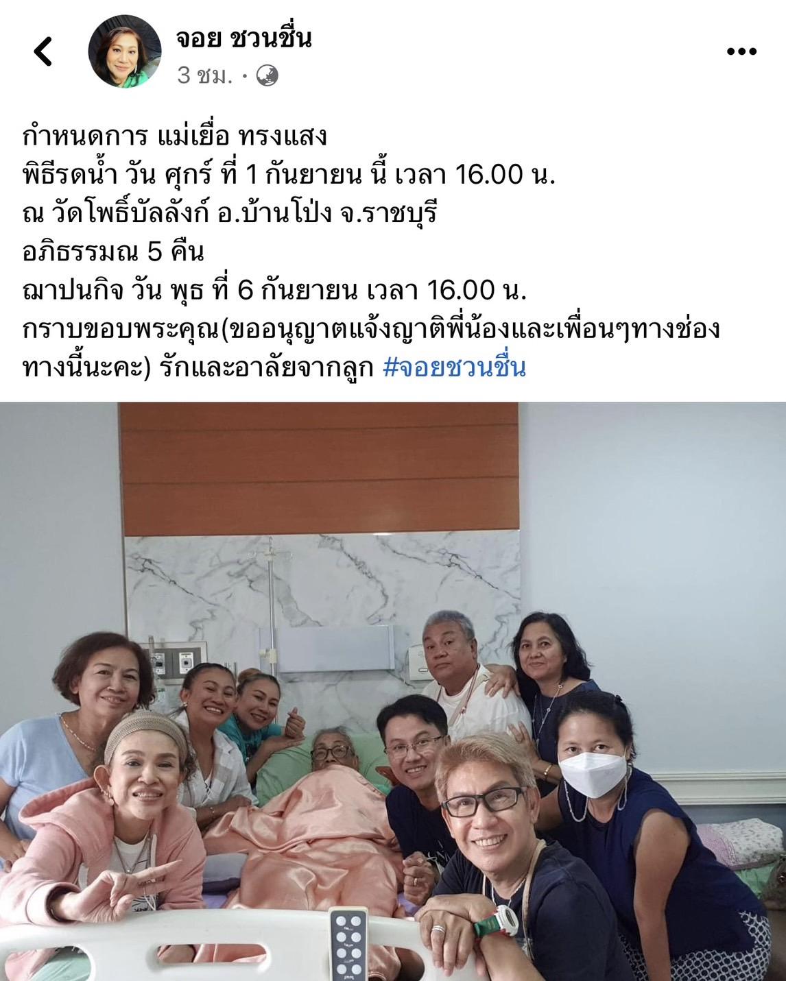 ฌาปนกิจ วันพุธที่ 6 กันยายน เวลา 16.00 น. กราบขอบพระคุณ(ขออนุญาตแจ้งญาติพี่น้องและเพื่อนๆ ทางช่องทางนี้นะคะ) รักและอาลัยจากลูก #จอยชวนชื่น" ทางบันเทิงไทยรัฐขอแสดงความเสียใจมา ณ ที่นี้ด้วยนะคะ.