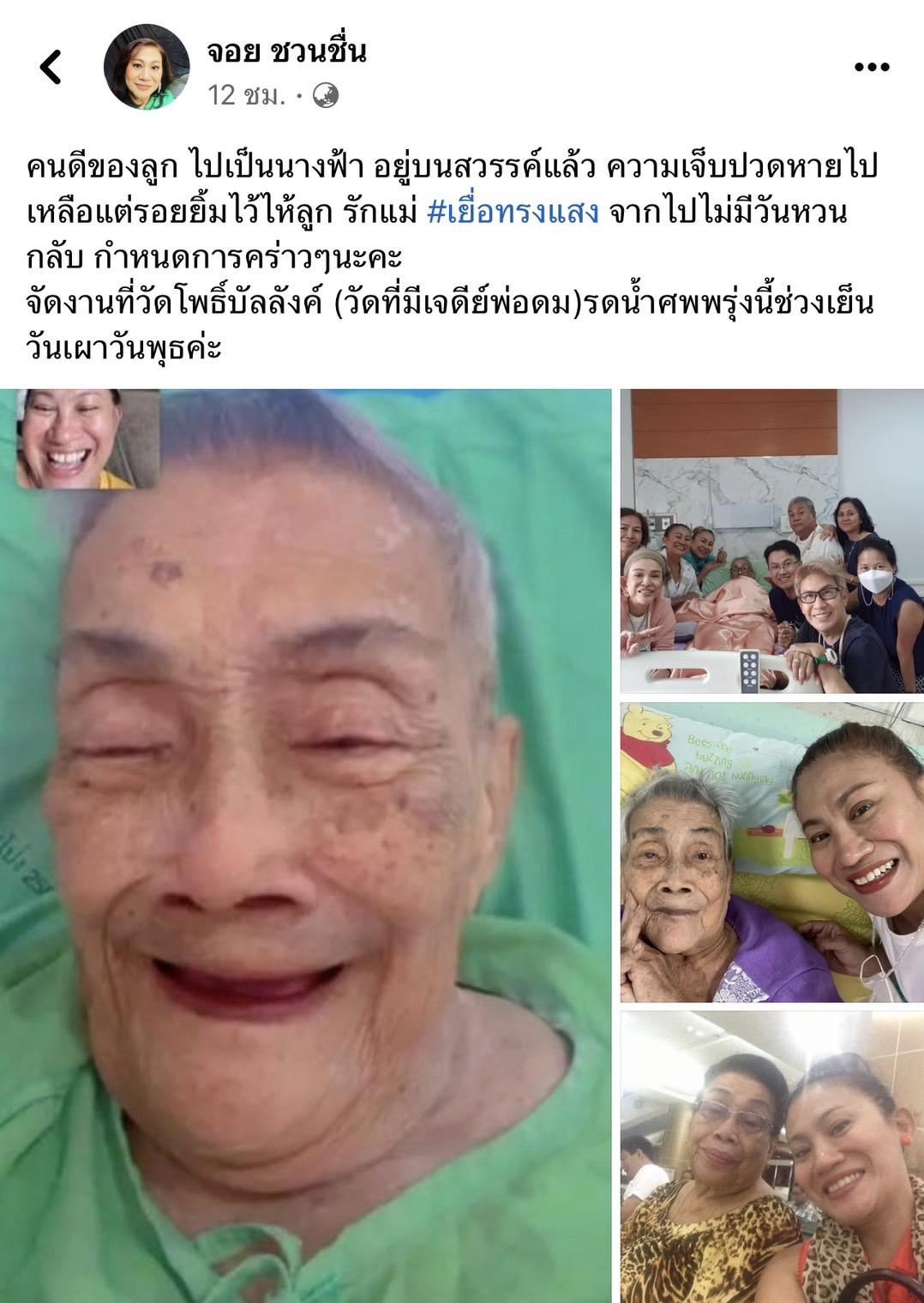 ซึ่งทางด้าน จอย ชวนชื่น โพสต์อำลาคุณแม่ ผ่านข้อความทางเฟซบุ๊กเอาไว้ว่า "คนดีของลูก ไปเป็นนางฟ้า อยู่บนสวรรค์แล้ว ความเจ็บปวดหายไป เหลือแต่รอยยิ้มไว้ให้ลูก รักแม่ #เยื่อทรงแสง จากไปไม่มีวันหวนกลับ กำหนดการคร่าวๆ นะคะ จัดงานที่วัดโพธิ์บัลลังก์ (วัดที่มีเจดีย์พ่อดม) รดน้ำศพพรุ่งนี้ช่วงเย็น วันเผาวันพุธค่ะ"
