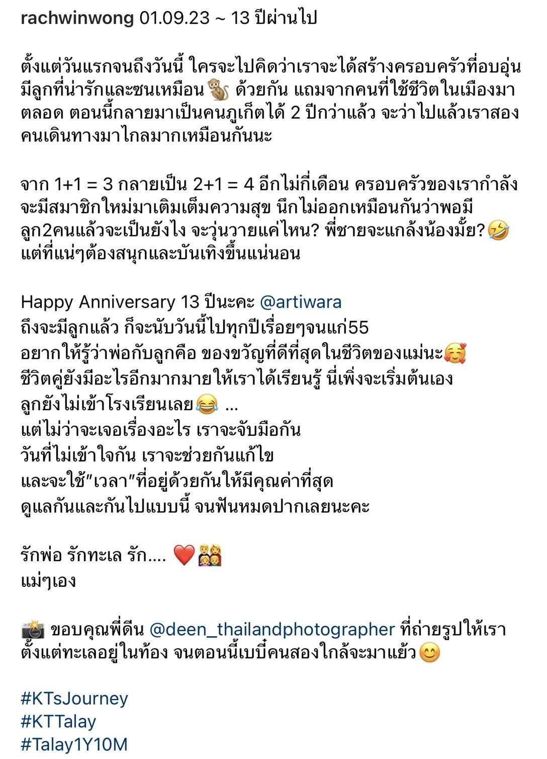 "Happy Anniversary 13 ปีนะคะ @artiwara ถึงจะมีลูกแล้ว ก็จะนับวันนี้ไปทุกปีเรื่อยๆจนแก่55 อยากให้รู้ว่าพ่อกับลูกคือ ของขวัญที่ดีที่สุดในชีวิตของแม่นะ ชีวิตคู่ยังมีอะไรอีกมากมายให้เราได้เรียนรู้ นี่เพิ่งจะเริ่มต้นเอง ลูกยังไม่เข้าโรงเรียนเลย … ไม่ว่าจะเจอเรื่องอะไร เราจะจับมือกัน วันที่ไม่เข้าใจกัน เราจะช่วยกันแก้ไข และจะใช้เวลาที่อยู่ด้วยกันให้มีคุณค่าที่สุด ดูแลกันและกันไปแบบนี้ จนฟันหมดปากเลยนะคะ"